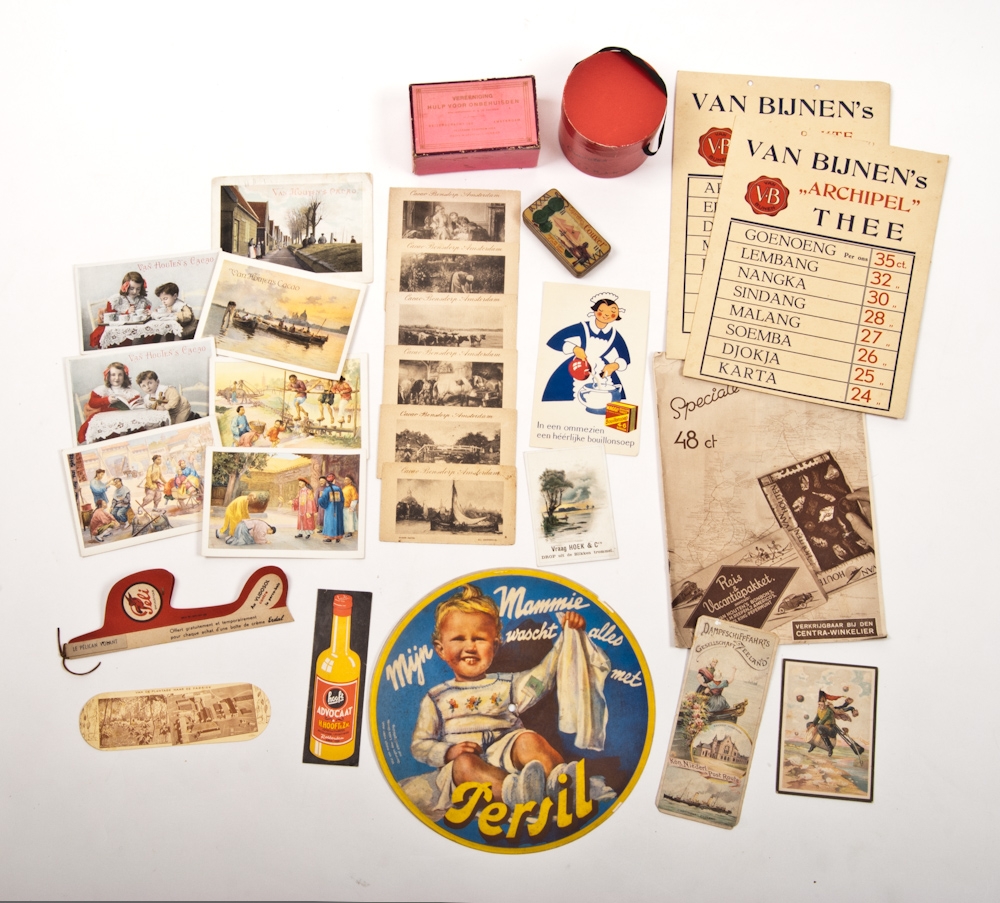 25 commercial cards, most by van Houten. + Record "Mijn Mammie wascht alles met Persil". + Cardboard box Vereeniging Hulp voor onbehuisden, Keizersgracht 152, Amsterdam. + Cardboard box Cravates Max Heymans. + Can Cigarettes Couvet - and 7 others.