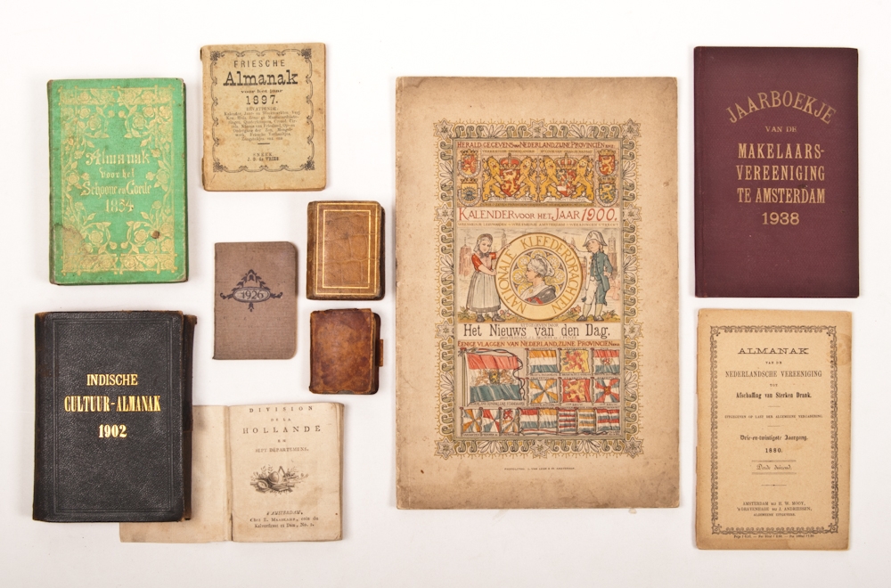4 almanacs, among which the 'Indische Cultuur-Almanak' of 1902, 1 yearbook of the Makelaarsvereeniging te Amsterdam 1938, 1 calendar of the year 1900 of Het Nieuws van den Dag with ills. of Dutch weapons and flags and all 11 provinces, 1 French calendar of the year 1926, a booklet with the administrative division of Holland in 7 departments (Napoleontic), a miniature note book, bound in leather, 4 x 5,5 cm. and a matchbox holder as bookbinding with metal parts to strengthen it, 4,5 x 6 cm.