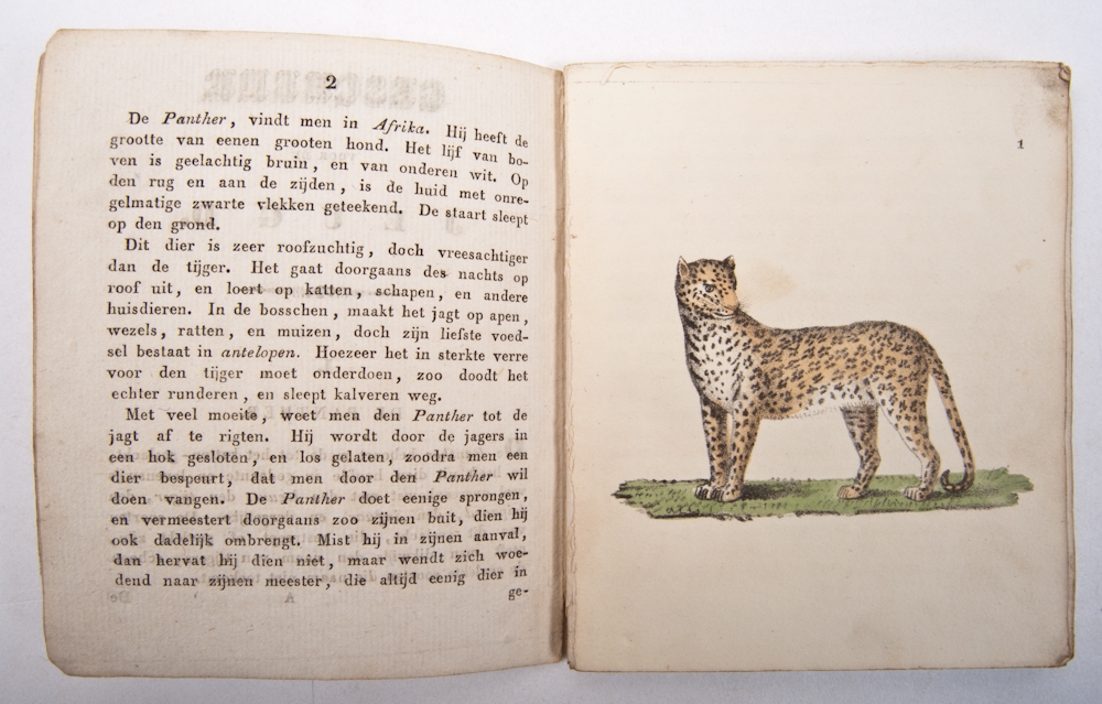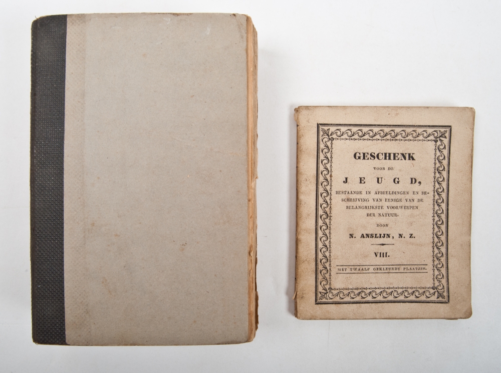 Added: Geschenk voor de Jeugd, bestaande in afbeeldingen en beschrijving van eenige van de belangrijkste voorwerpen der natuur. By N. Anslijn, N.Z. VIII. Te Leyden bij D. du Mortier en Zoon, 1835. 11,5 x 13 cm., 40 p. with 12 coloured lithogr. by the author.