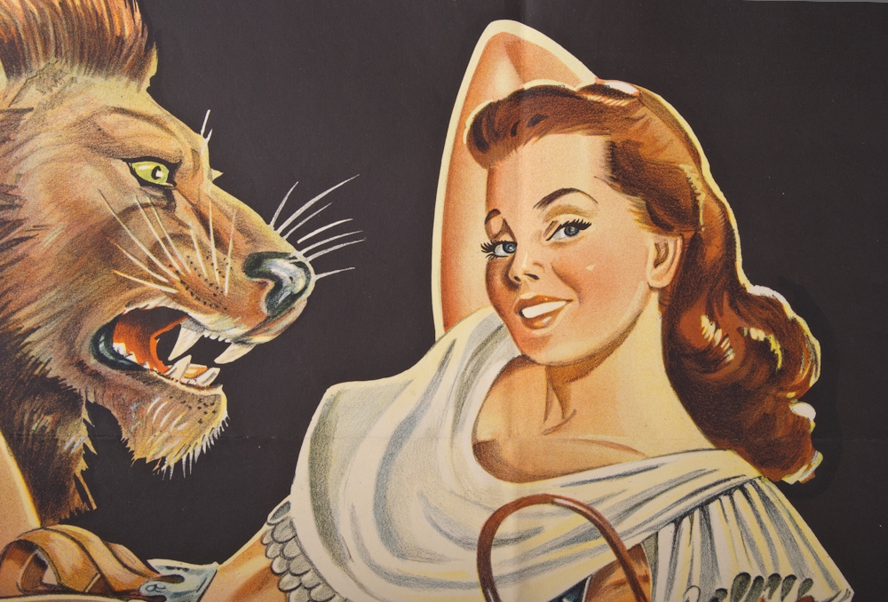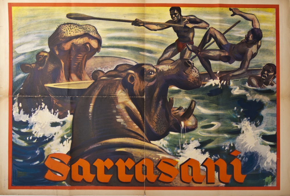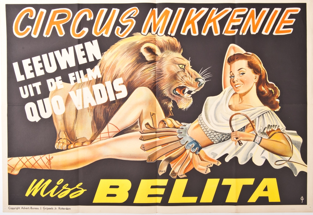 Two hippos against canoeing aboriginals. Ca. 1950. 58 x 86 cm, folded. + Circus Mikkenie lions from the film Quo Vadis "Miss Belita", 1952. 55 x 79 cm. Folded.