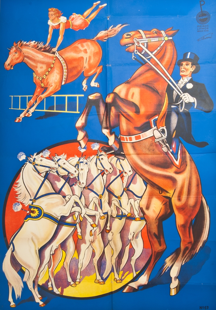 Einmalige nie dagewesene Welt-Sensation. P.F. Tillmann, 1949. Primus Lithos, Berlin SO 36. 123 x 86 cm. Folded. + Poster without text, horse training, primus litho no. 67. 122 x 85 cm, folded. Both in good condition.