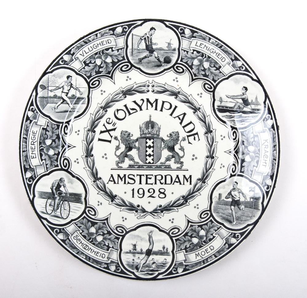 Vlugheid, lenigheid, kracht, moed, schoonheid, energie. IXe Olympiade Amsterdam 1928. Société Céramique Maastricht, Holland. Decorative plate. Diameter 25 cm.