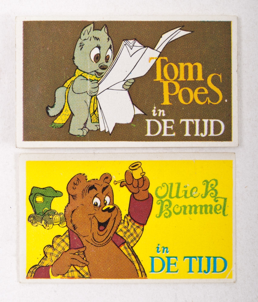 Schimmenspel theatre, construction plate that was published in "Ons Vrij Nederland", 1945. + 3 poezieplaatjes, ca. 1950. + Kiddy Toys Tom Poes pop + 10 cigar bands Graf Tilly + handmade envelope case with Hocus Pas, ca. 1945. + Veilig Verkeerspel, RPS, 1953 (mediocre copy) - and 6 others.