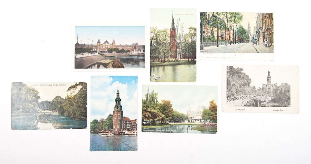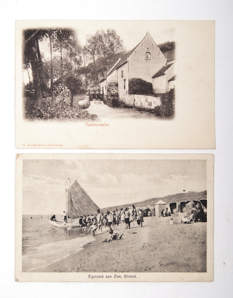 Two folders containing 674 cards of Dutch places. Most are unsent and date between 1910 and 1950 + 1 folder containing 126 cards of Amsterdam. Most are used and date from the same period.