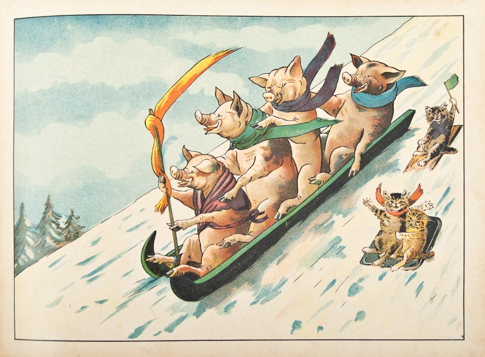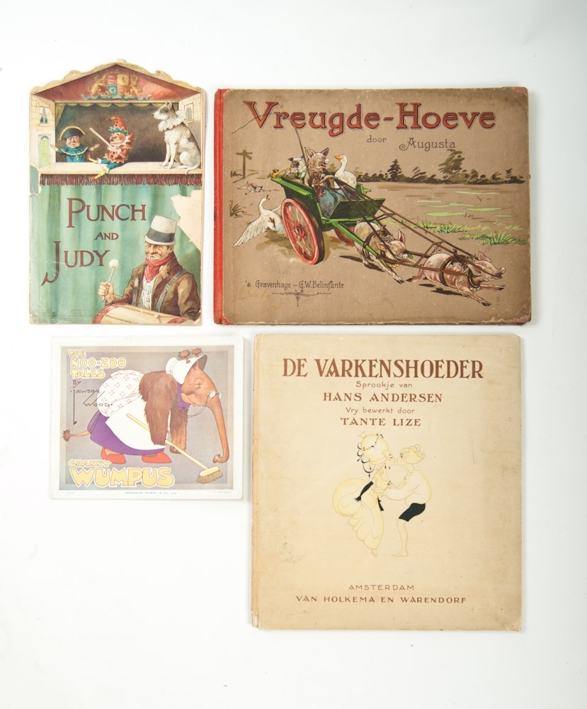 Augusta. 's-Gravenhage, G.W. Belinante, ca. 1910. 34 p. Oblong, clothbacked boards + The Noo-Zoo tales. Lawon Wood: Granny Wumpus. Frederick Warne & Co, ca 1930. 12 p. + Punch and Judy. Ca. 1880. 16 p. Front cover chipped centre right, lacks back cover. Early die-cut - and De Varkenshoeder. Sprookje van Hans Andersen Vry bewerkt door Tante Lize. Amsterdam van Holkema en Warendorf. Ca. 1925. 26 p.