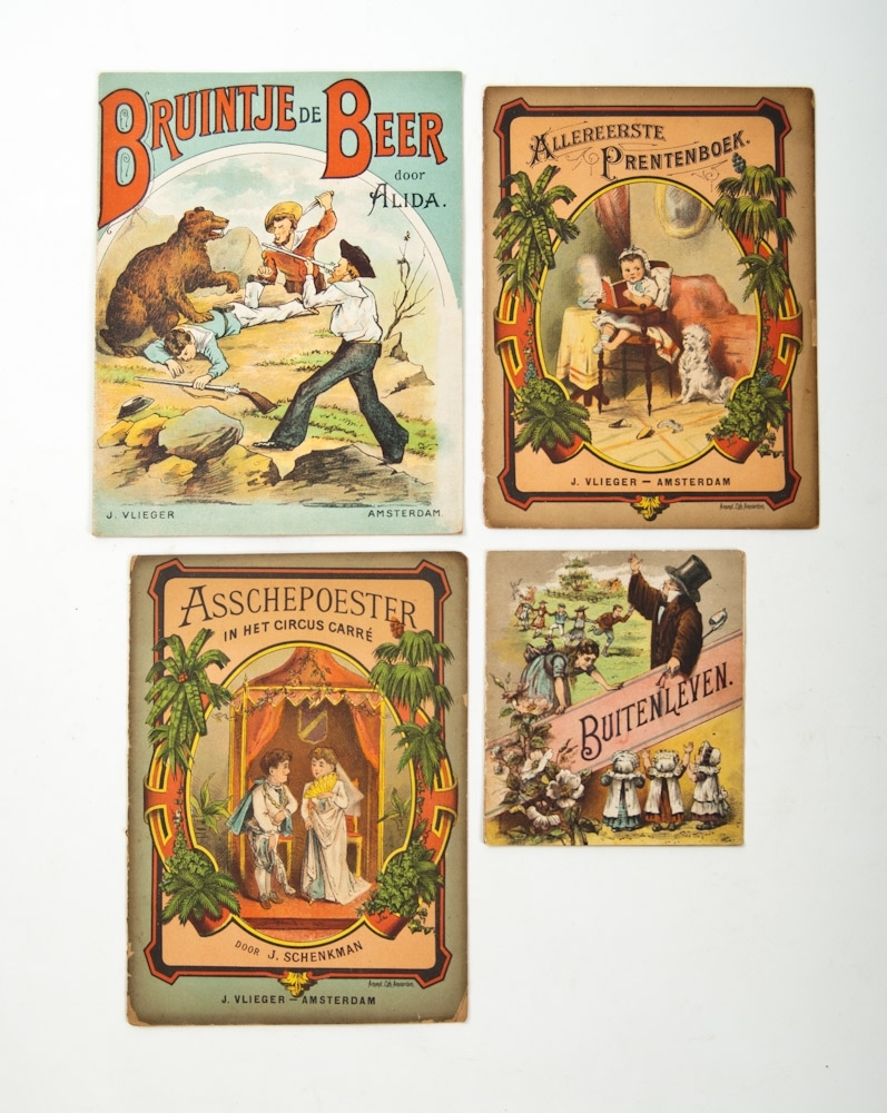ca. 1880 + Asschepoester in het circus Carré. J. Schenkman, 20 p. (sl. loose in spine) Bruintje de Beer door Alida. Ca. 1900. 6 p. and 5 p.-sized lithos, one of which is double-p. - and 1 other. All published by J. Vlieger, Amsterdam.