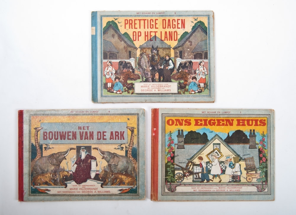 Prettige Dagen op het Land. Naar het Amerikaansch door Marie Hildebrandt met teekeningen van George A. Williams. Oblong, clothbacked boards, 18 p. Book has plates on which characters have been pasted. This is vol. 2 from the series. + Het Bouwen van de Ark. Vol. 4 (idem) and Ons Eigen Huis, vol. 1.
