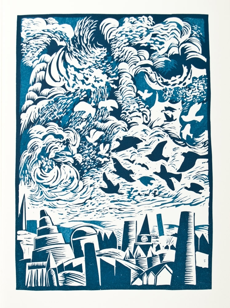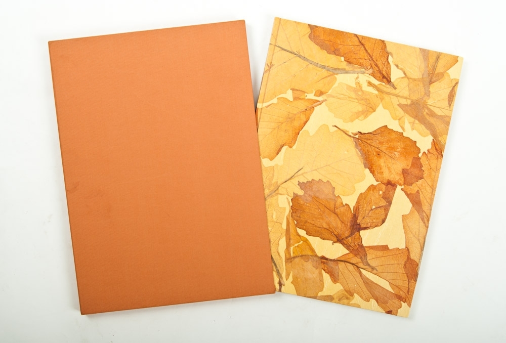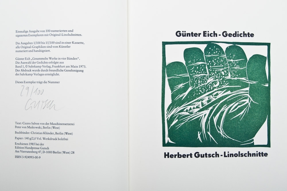 Günter Eich-Gedichte/Herbert Gutsch-Linolschnitte. 1985. Folio, nr. 29/100, signed by the artist. Cover covered with tree leaves. In slipcase.