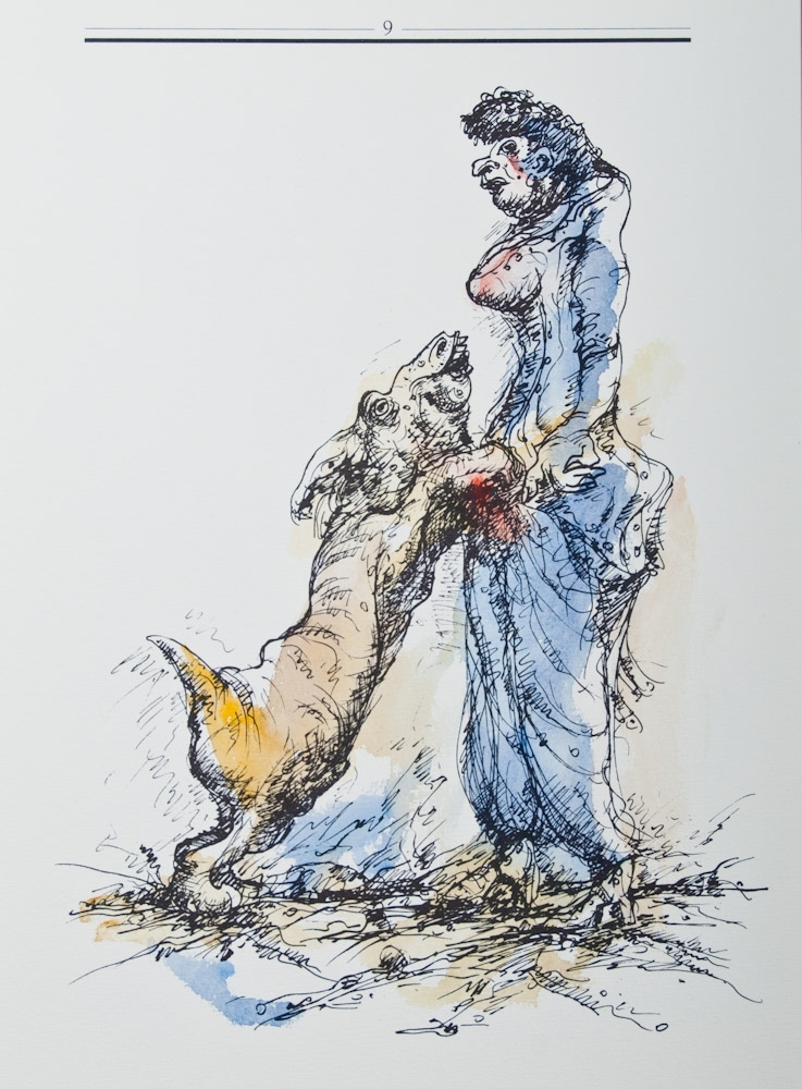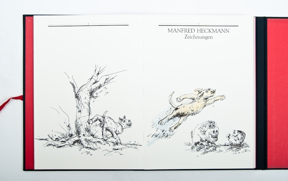Über Köter & Menschen. Kurt Tucholsky/Manfred Heckmann. Ed. Handpresse Gutsch, 1985. Unnumbered circulation of 125 copies. 60 p. With binding ribbon that makes up the tongue of paper dog's head (pasted on by hand) on the cloth binding.