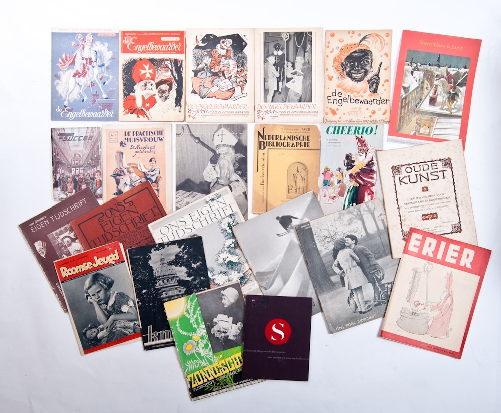 Lot with several magazines. ''Dagen, ja weken van te voren denkt de zorgzame moeder hoe haar kinderen die dag te vermaken.'' Dec. 1928; Nederlandsche Bibliographie, maandblad voor boekenvrienden, St. Nicolaas issue 1942; PTT Bedrijfsbanden, maandblad voor het personeel van het staatsbedrijf der PTT, 1948. With the story ''Sinterklaas en de knecht die niet echt was'' - and 18 others.