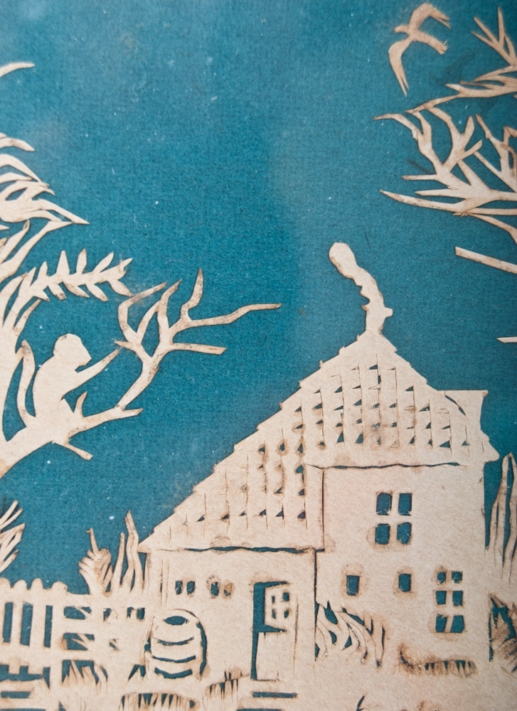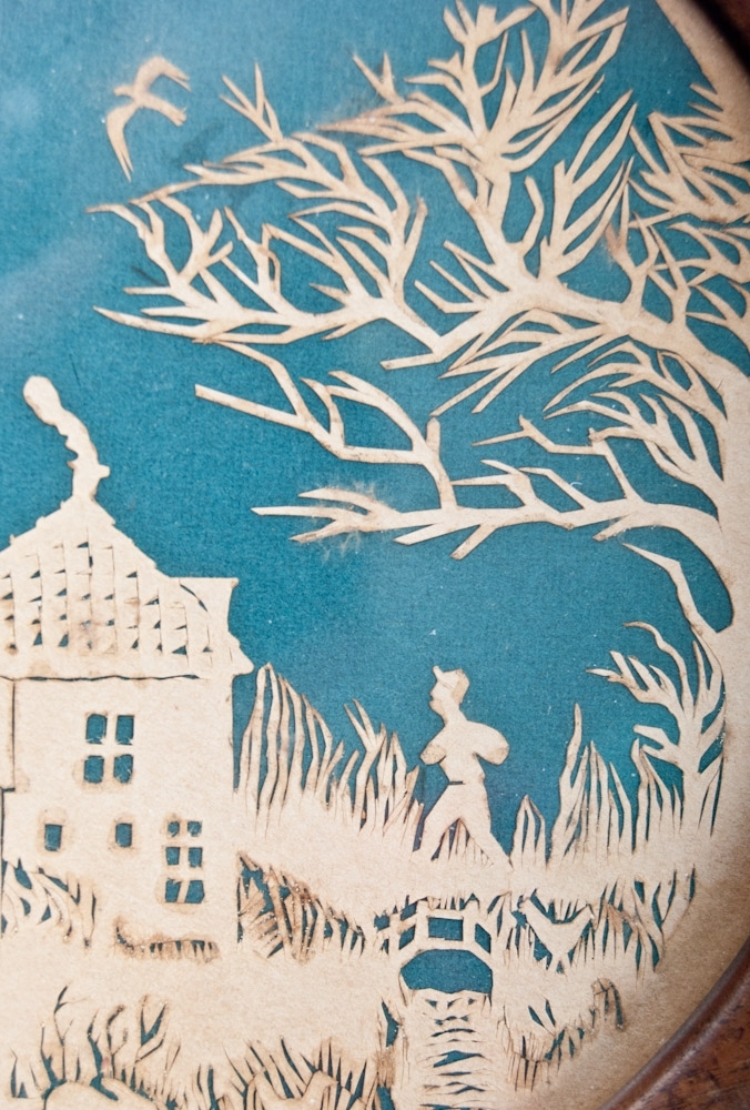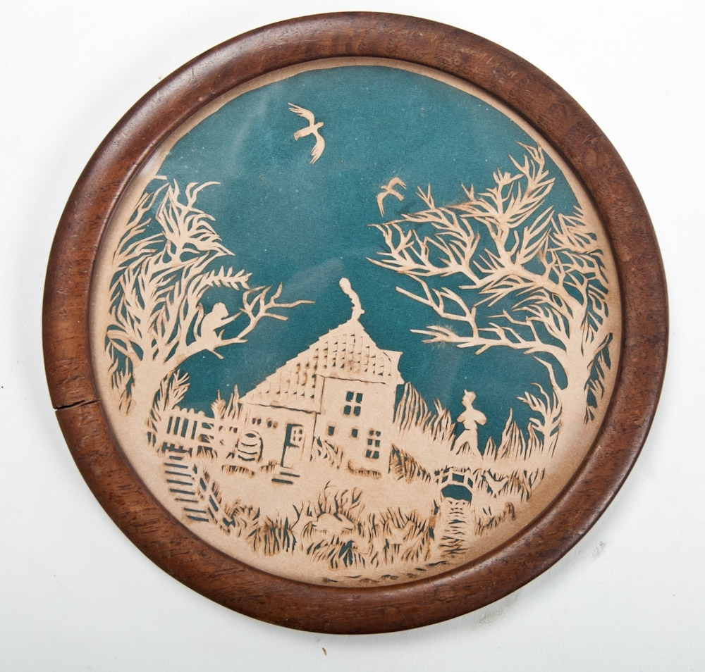 Circle-shaped cutting of country scene, first half 19th century. Diameter 13 cm. In frame behind glass.