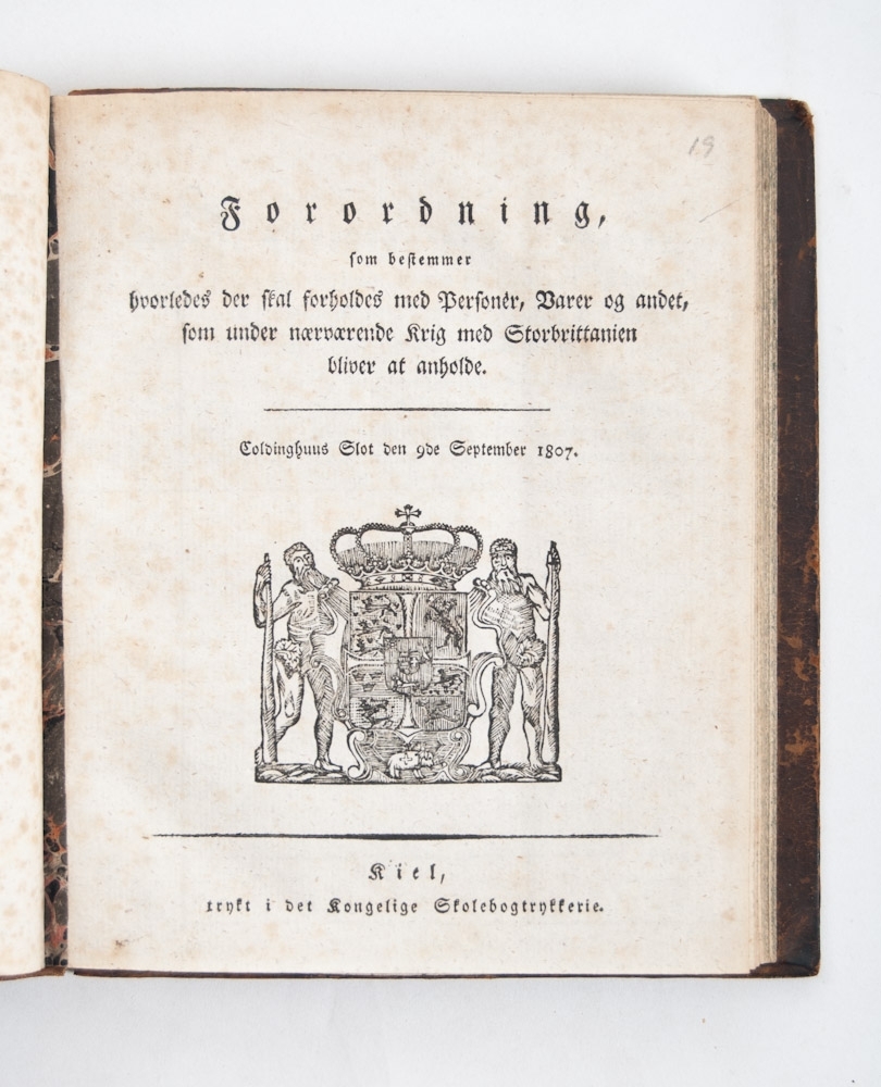 Small 4to., leather binding, marbled endpapers. Text is in Danish and the "plakaten en ordonnancien" are predominantly published in Copenhagen and a few of them in Kiel, under the role of Christiaan VII and Frederik VI, kings of Denmark and Norway. Several circulaires with hs in ink. Pages (wrongly) numbered in pencil. Highly interesting collection, especially because of the historically important documents with regards to Napoleon and the British in their battle for the neutral country of Denmark.
