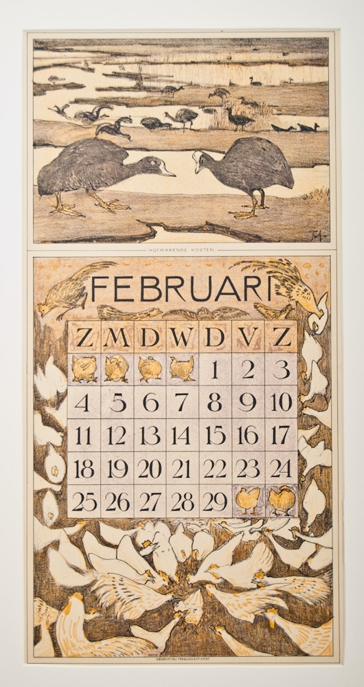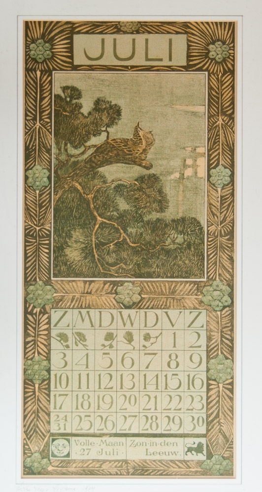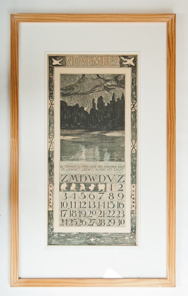 Nine calendar leaves from the period 1904 - 1913 with pictures by Theo van Hoytema (1863 - 1917), printed on stone. Printed at Tresums en Co Amsterdam. Size 47.5 x 21.2 cm. In frame behind glass or in passe-partout. In impeccable condition.