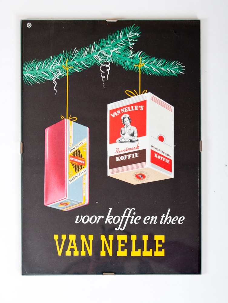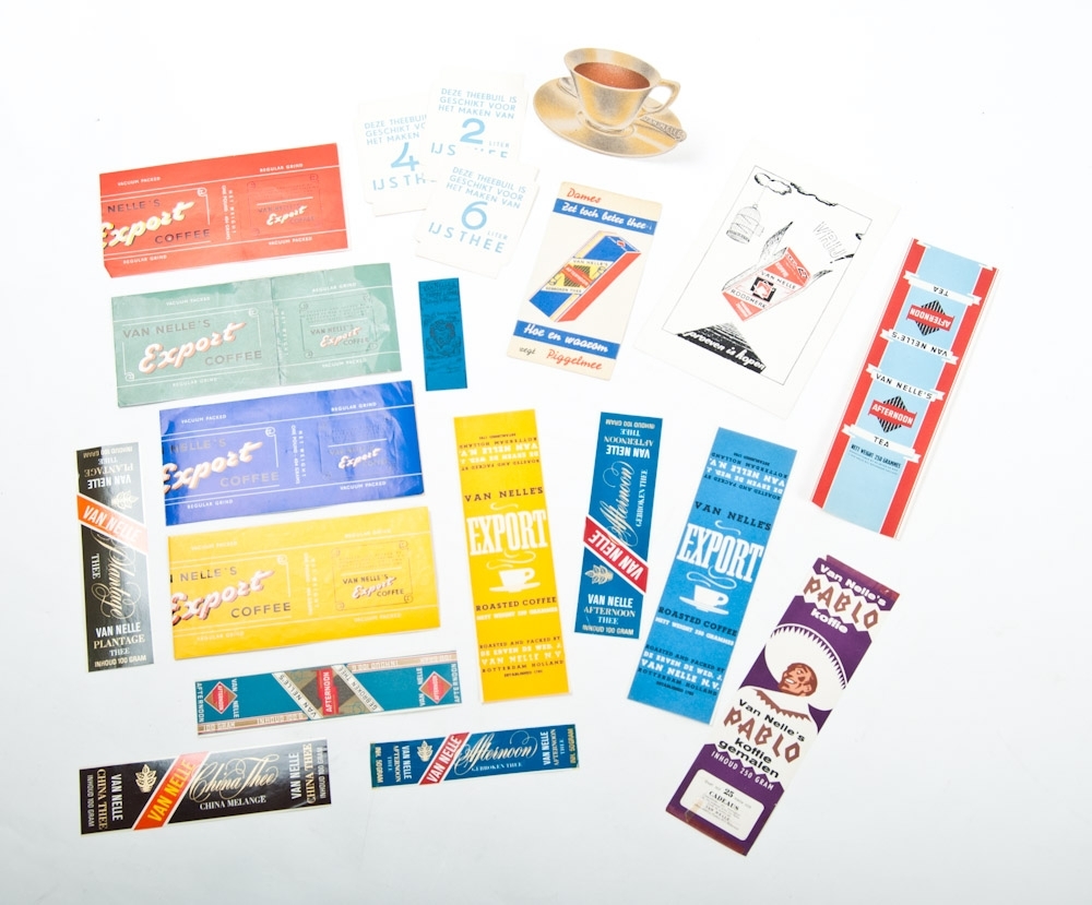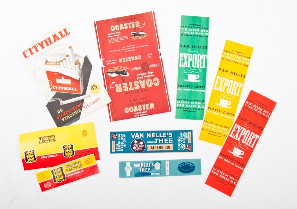 Small advertising poster of Van Nelle koffie -en thee. Ca. 1950, in frame behind glass + Several packaging labels of coffee and tobacco, ca. 1940-1960. In very good condition + 7 others.