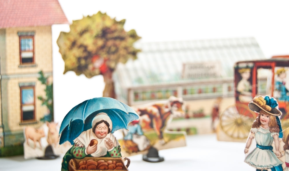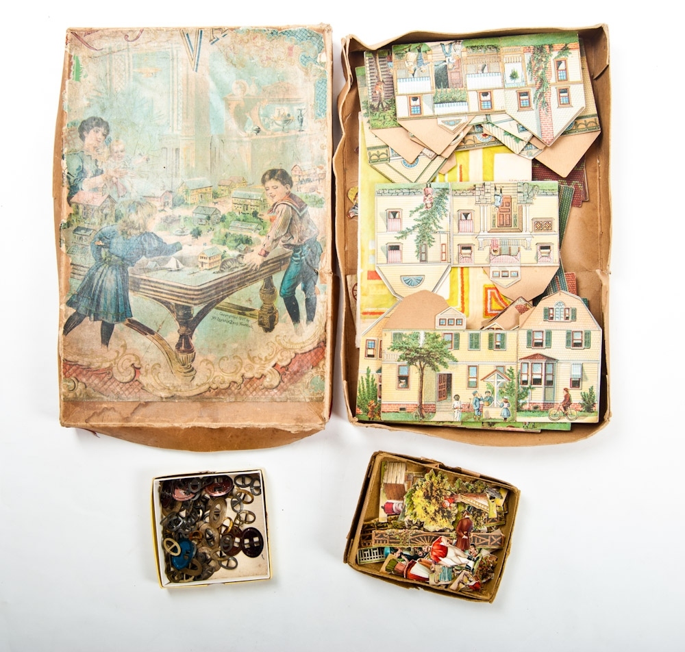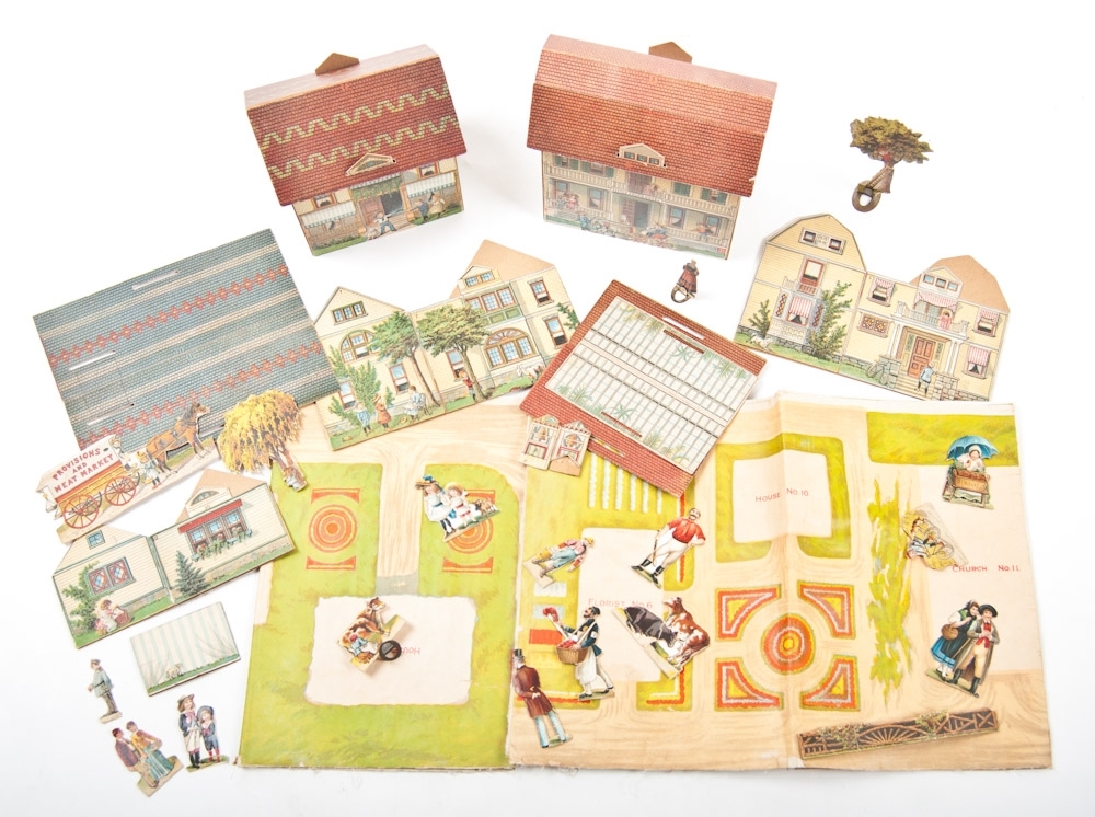 An edition of Mc Loughlin Bros, New York, 1897. Set of 18 cardboard houses with folding paper base. With matching attributes and characters, and several additional characters. In original box that is damaged along the edges.