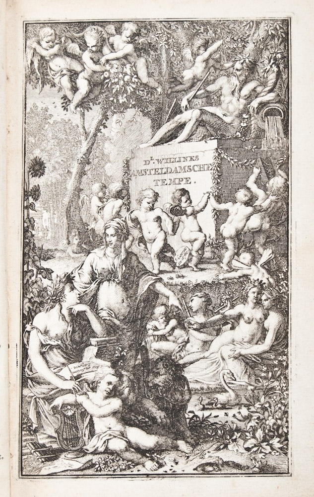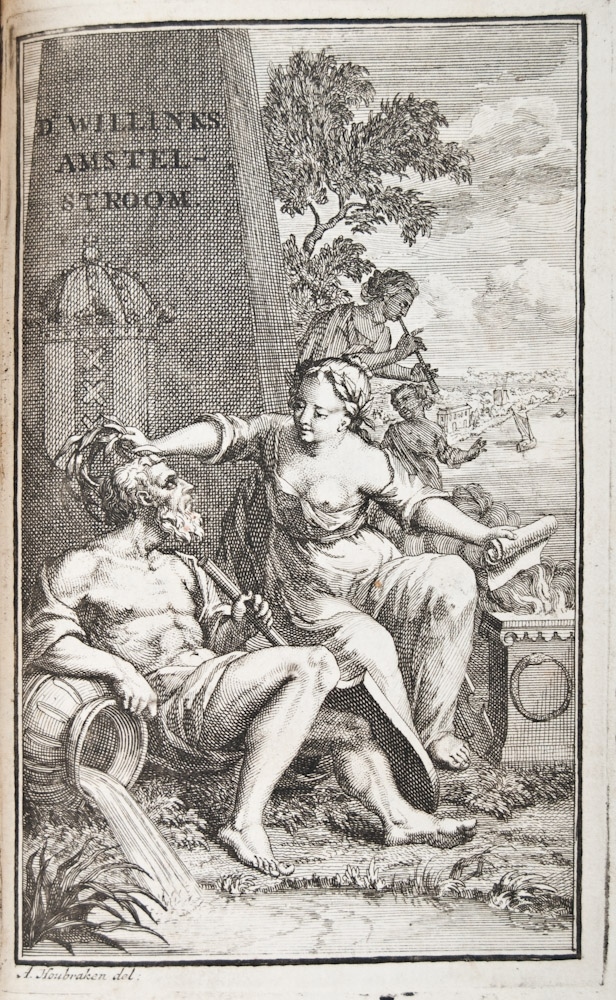 Small 8vo., 1st ed. frontispice in copper engraving, [34],127,[12],36 p., copper engravings by A. Houbraken. Den Amstelstroom in 2nd print. Complete and in good condition.