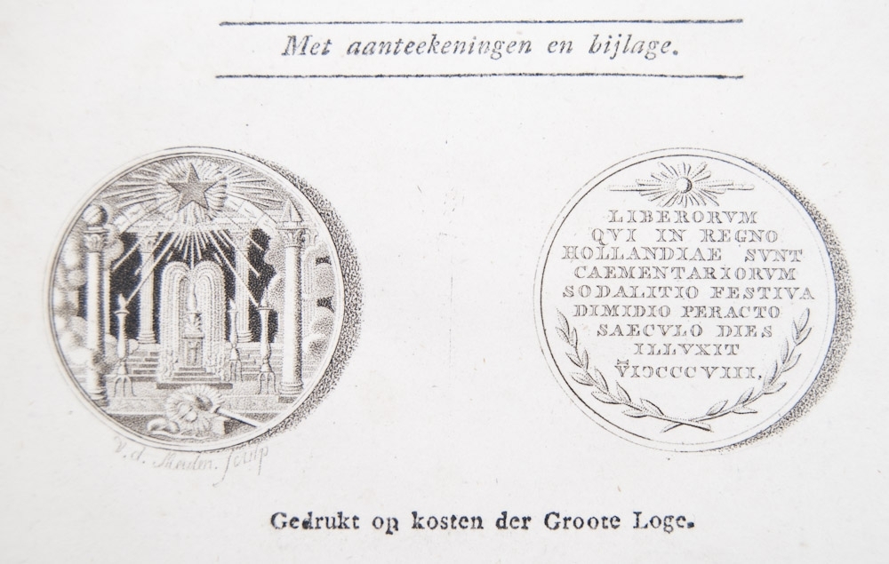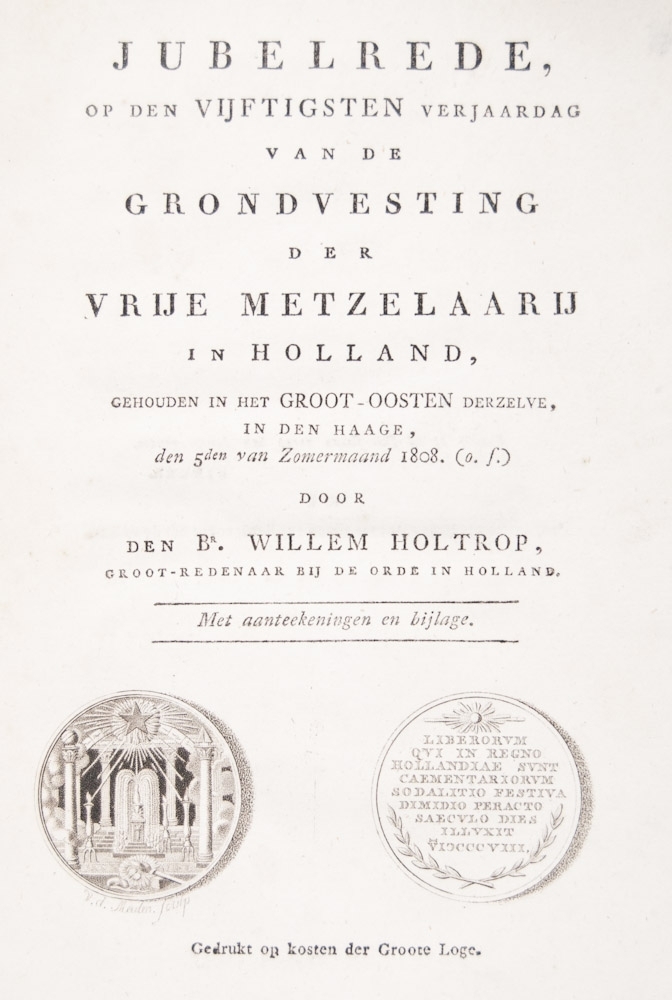 Jubelrede, op den vijftigsten verjaardag van de grondvesting der vrije metzelaarij in Holland (..) Willem Holtrop, Den Haag, Gedrukt op kosten der Groote Loge, 1809, 92p.