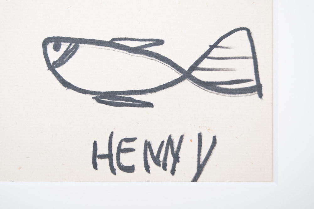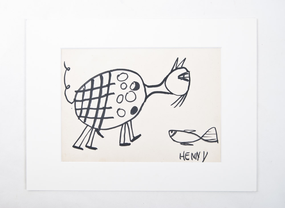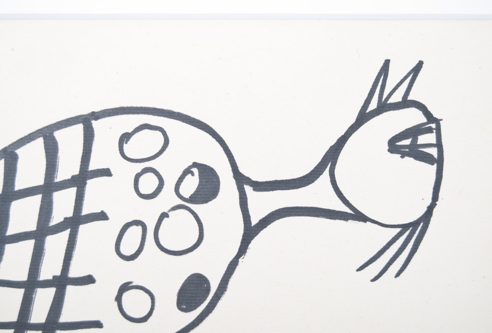 "Kat en vis" 1953. Watercolour in black-and-white by Riemens, Corneille's girlfriend in the time that they were living together in Paris with several other prominent Cobra members. 35 x 25 cm. Under passe-partout.
