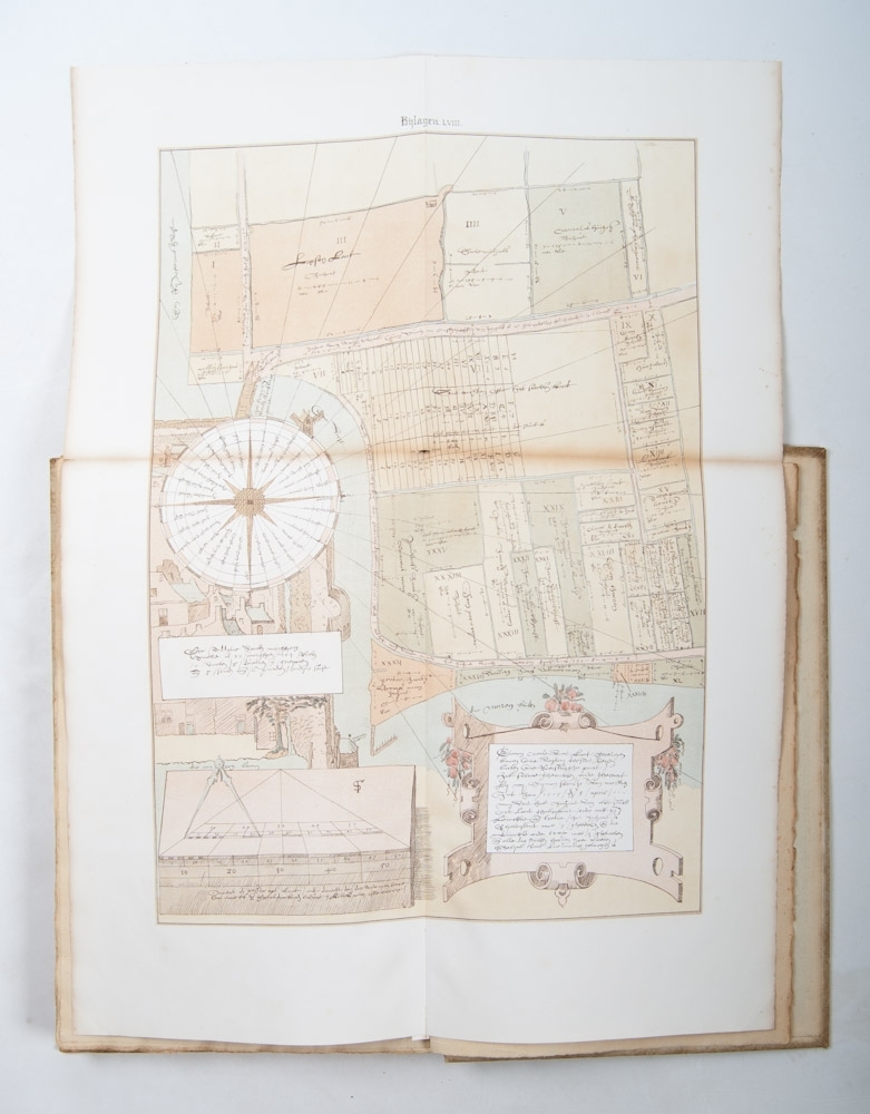 Photolithographic image of a 1578 plan (..) W. Pleyte, Leiden, E.J. Brill, 1874. With 61 double-p. & single-p. plates, cards & facs. Folio, vellum with gilt coat-of-arms of Leyden on both bindings. Edition of 20 copies, no colophon. 1 plate has been replaced by a facs. photolitho. With ex libris.
