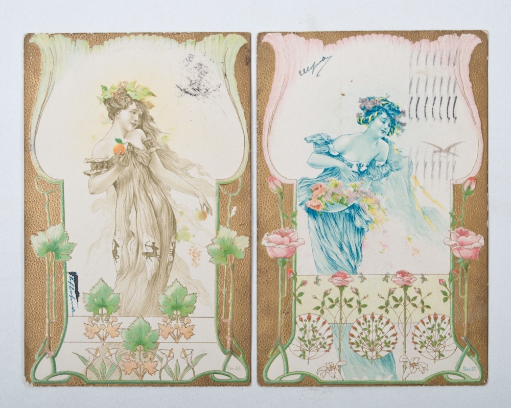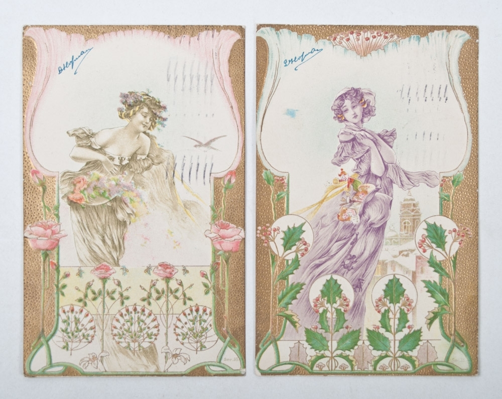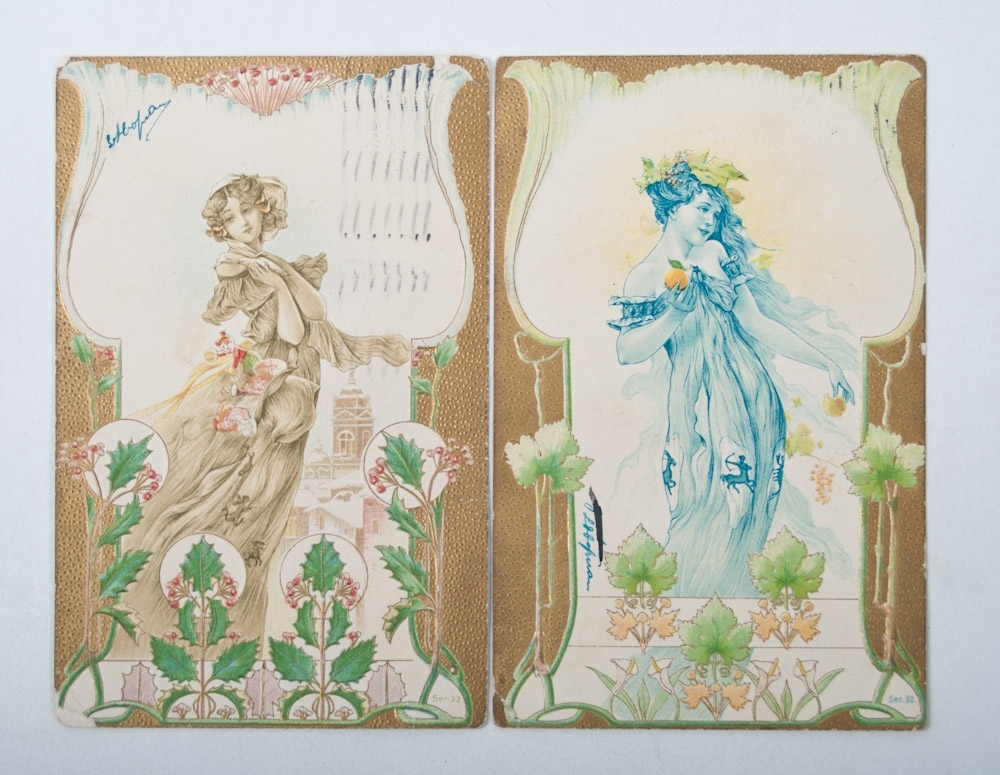 Set of 6 postcards in relief print of women in characteristic Jugendstil style, ca. 1908. Sent, with name written on front, and stamp from 1909.