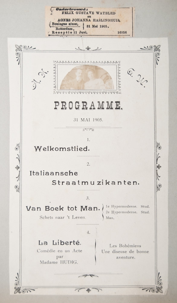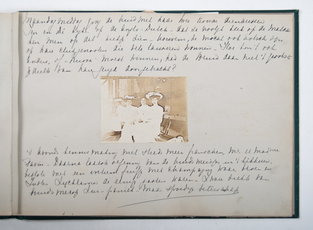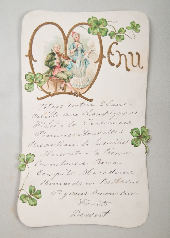 40 p. With handwritten texts, photos and 8 beautiful menus. Oblong, dark green cloth.