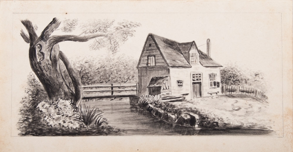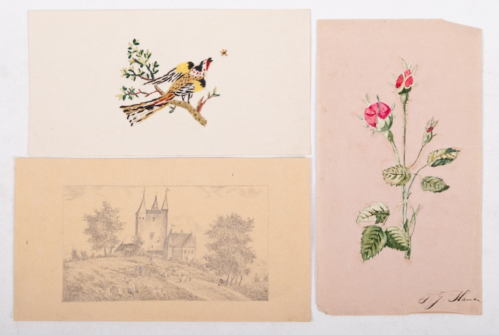 Embroideries, drawings, watercolours and a text, total 16 x.