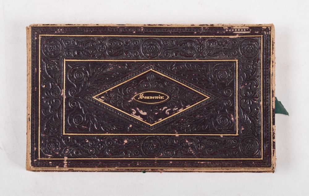 Box, 17x10x2 cm., oblong shaped, 12mo., booklet, gilt-edged, folding, containing 16 card prints, most in colour, interesting collection.