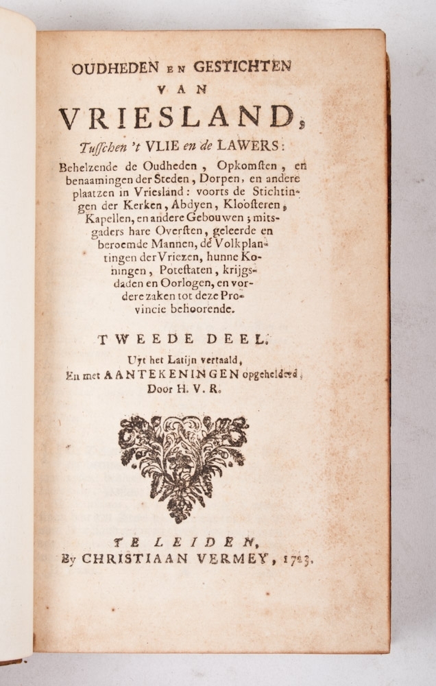 Behelzende de Oudheden, Opkomsten en benaamingen der Steden, Dorpen en andere plaatzen van Vriesland (...) en vordere zaken tot deze Provincie behoorende. [Vols. I and II]. [Heussen H.F. van en vert. H. van Rijn], Leiden, Christiaan Vermey, 1713.