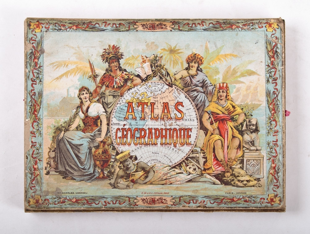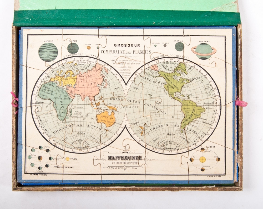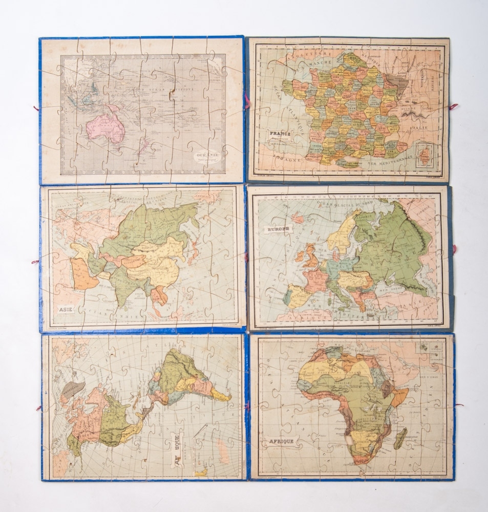 A.W. & G.L. Editeurts, Paris, imp. Charles Verneau. Ca. 1870. Illustrative lithogr. box with 7 puzzles: World map, France, Oceania, Asia, Europe, America and Africa. Each 33 x 23,5 cm.