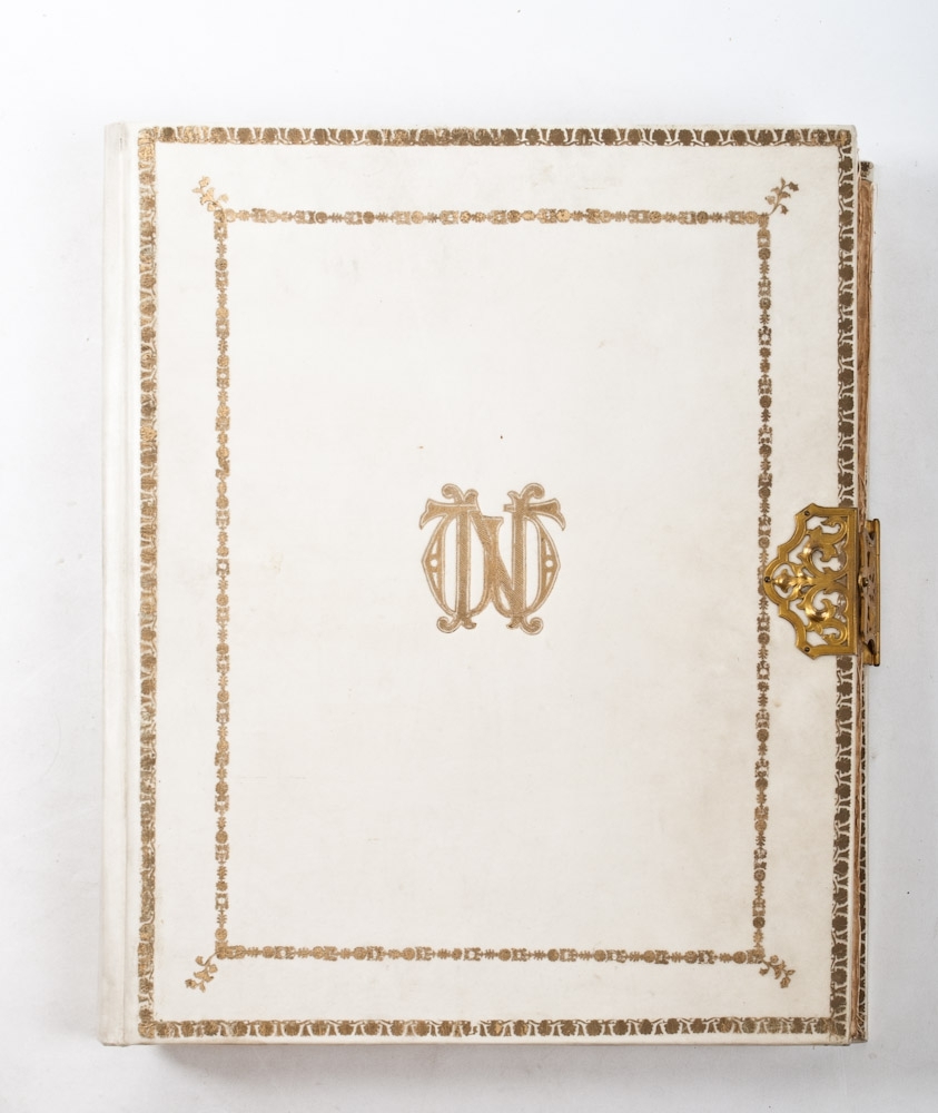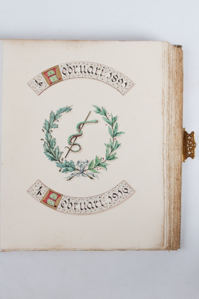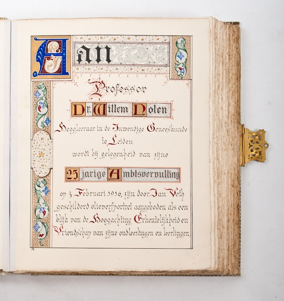 Leiden, 1916. Vriendenboek voor professor dr. Willem Nolen. Hoogleeraar in de Inwendige Geneeskunde te Leiden tgv. zijn 25 jarige Ambtsvervulling op 4 februari 1916. Folio (43 x 35,5 cm.) vellum album with copper lock and gilt fittings and initials. With several nicely calligraphed and handpainted pages and 387 signatures of students and former students.