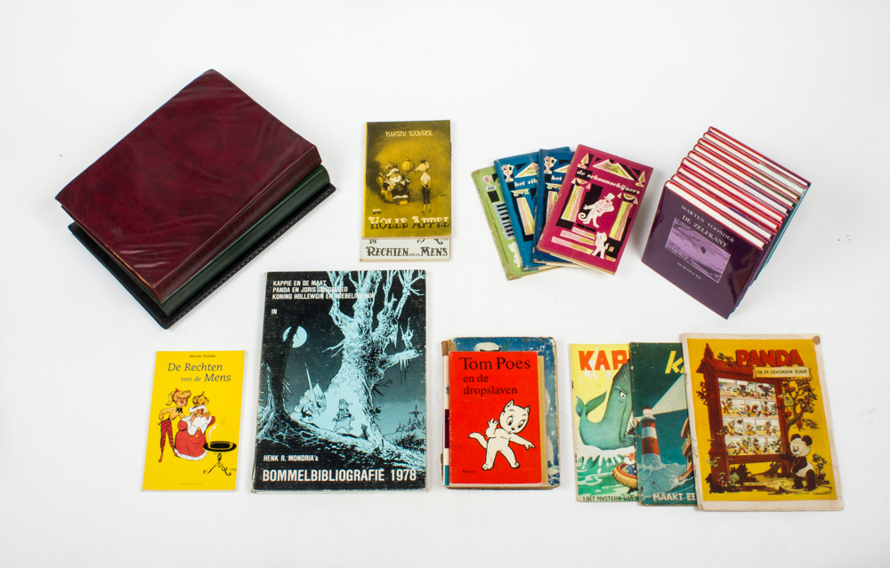 De Tijd magazine pages. 3 files with the pages with the Bommel stories. Incl. Tom Poes en de Wadem, Tom Poes en de Weetmuts and Heer Bommel en de Denktank. Total ca. 400 pages + Bommelbilbiografie 1978. Henk R. Mondria, 1978. No. 89/250. Bound, folio. Sm. dam. on spine + Panda en de Gevonden Schat. OMO edition, 1953. Dam. spine and edges, inside good - and another 21 items.