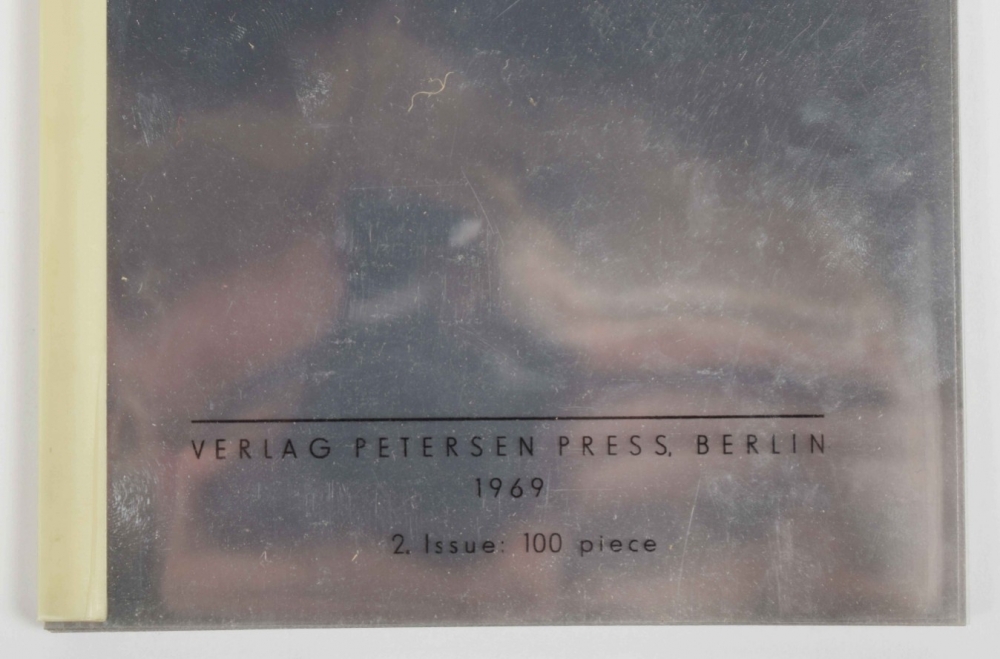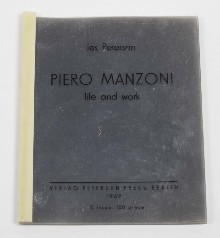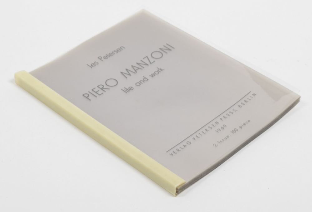 Berlin, Verlag Petersen Press, 1969. Second edition. 18 x 15 cm, 60 translucent pp. Plastic clip binding. Edition of 100. All-blank artists' book conceived by Manzoni just before his death in February 1963, published posthumously later that year.