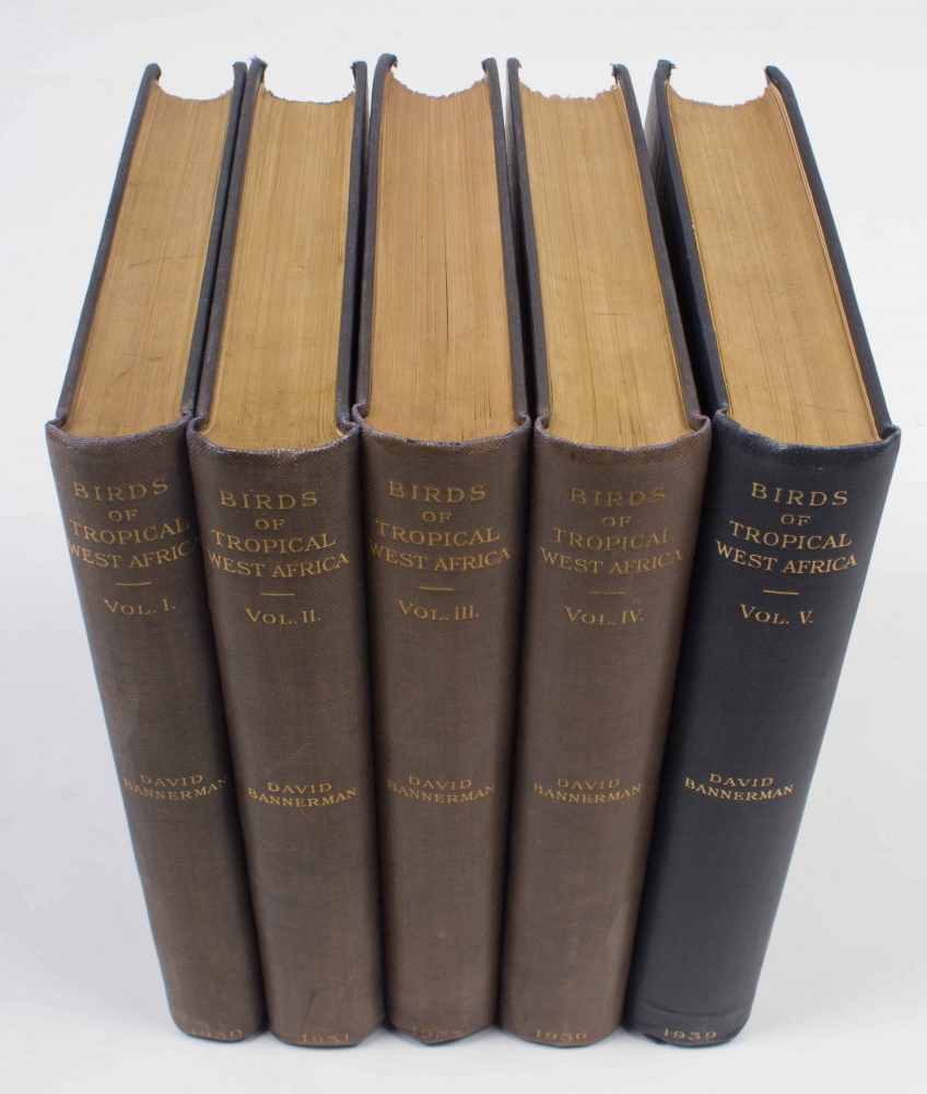 With Special reference to those of the Gambia, Sierra Leone, The Gold Coast and Nigeria. By David Armitage Bannerman. Vol. I-V. London, Crown Agents for the Colonies, 1930-1939, 5 (of 8) vols., with (folding) maps and numerous coloured plates and illustrations, original uniform cloth, top edges gilt, 4to (spine trifle discoloured).