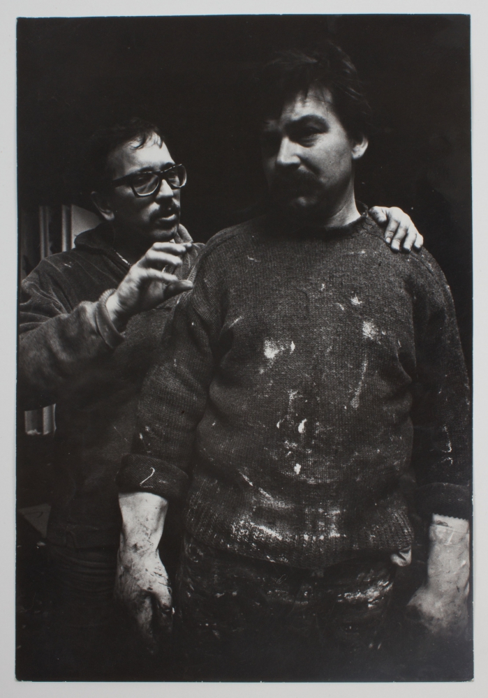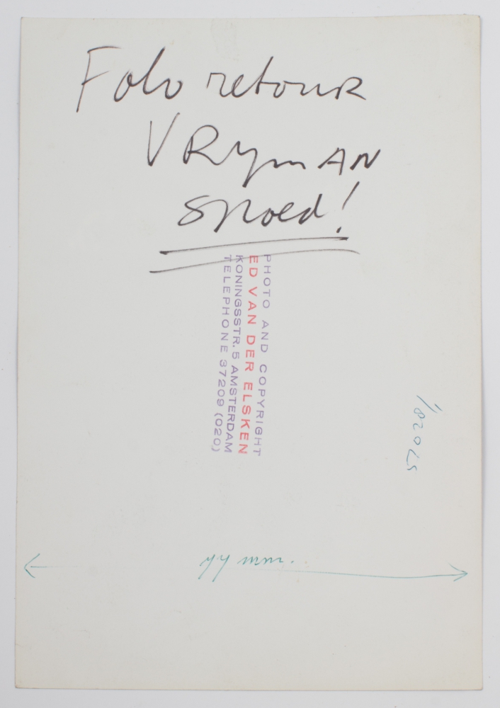 Karel Appel and Jan Vrijman. Gelatin silver print. 23.7 x 16 cm. Stamp of Van der Elsken and text "Foto retour Vrijman spoed!!" on the back. Published in Musique Barbare, 1961, p. 14.