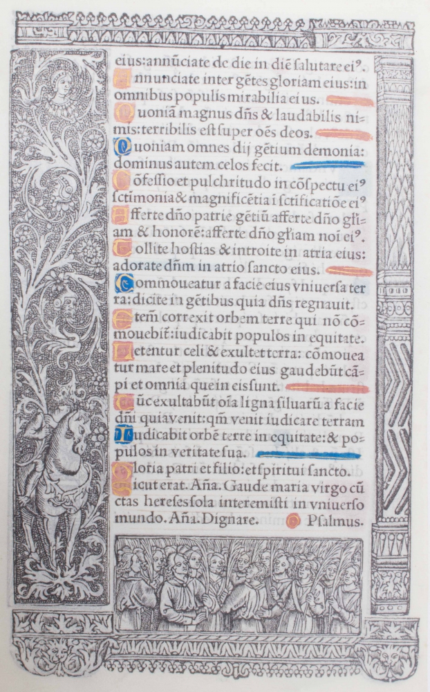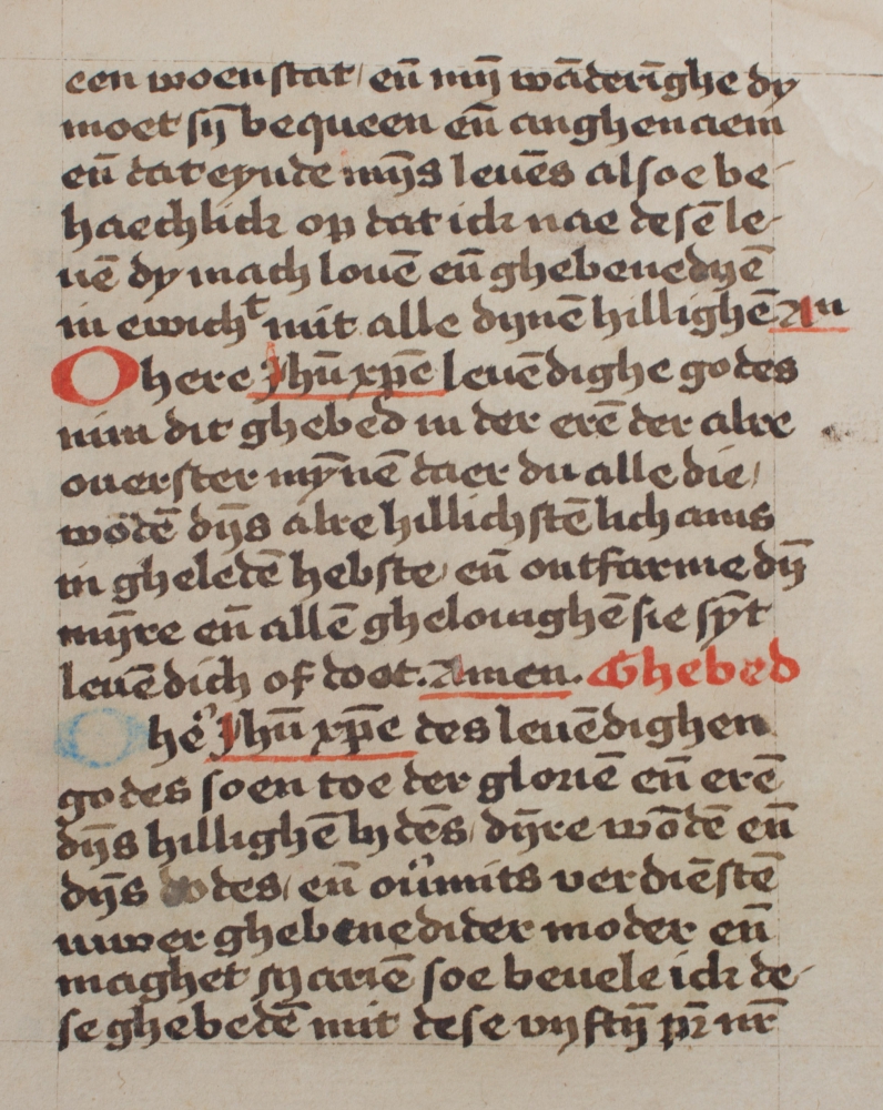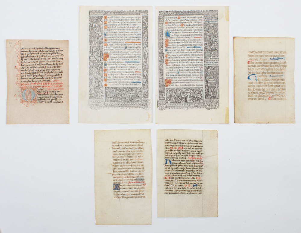 2 double-sided handwritten parchment sheets, 2 x 19 x 12 cm., coloured initials and woodcuts. And: 4 double-sided written parchment sheets, 13.5 x 9.5 cm., with coloured initials.