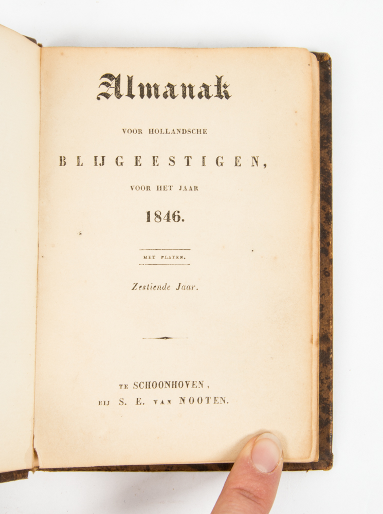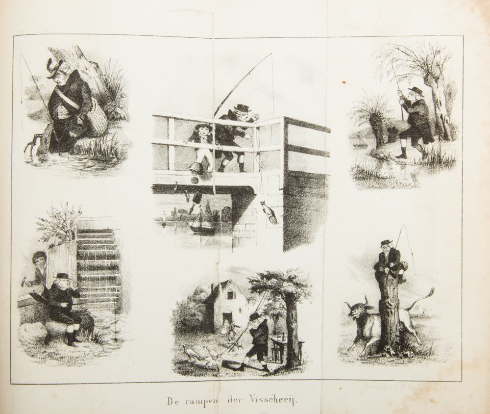 Almanac with the usual general information, followed by miscellanea, most humorous and moralistic chapters with at the beginning a lithograph of "lovers" and with the chapter Tom Dolly of de rampen der visscherij a folding lithograph with 6 atypical fishing scenes. Binding with traces of use, inside somewhat tanned; lithographs with stains, mostly outside the image; else charming and good.