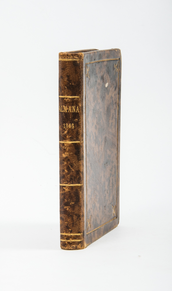voor het jaar 1846. Schoonhoven. S.E. van Nooten. 12mo, leather, title on spine with gilt stamping, front cover with line embroidery and lilies in the corners in gilt stamping. 189,(1),(2) pp.