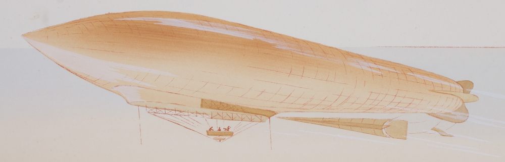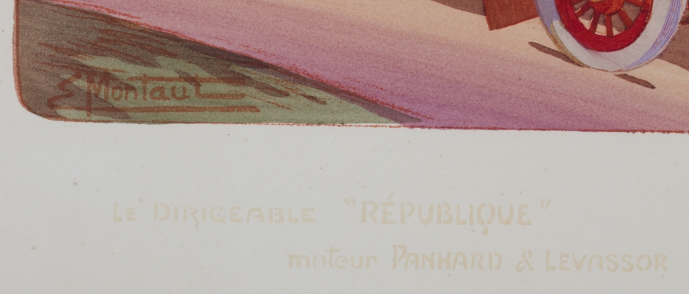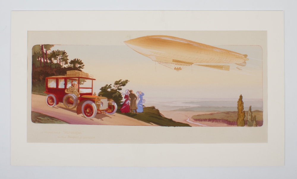 "Le Dirigeable "République" moteur Panhard & Levassor". Aquatint, Paris, ca. 1900. 90 x 45 cm.