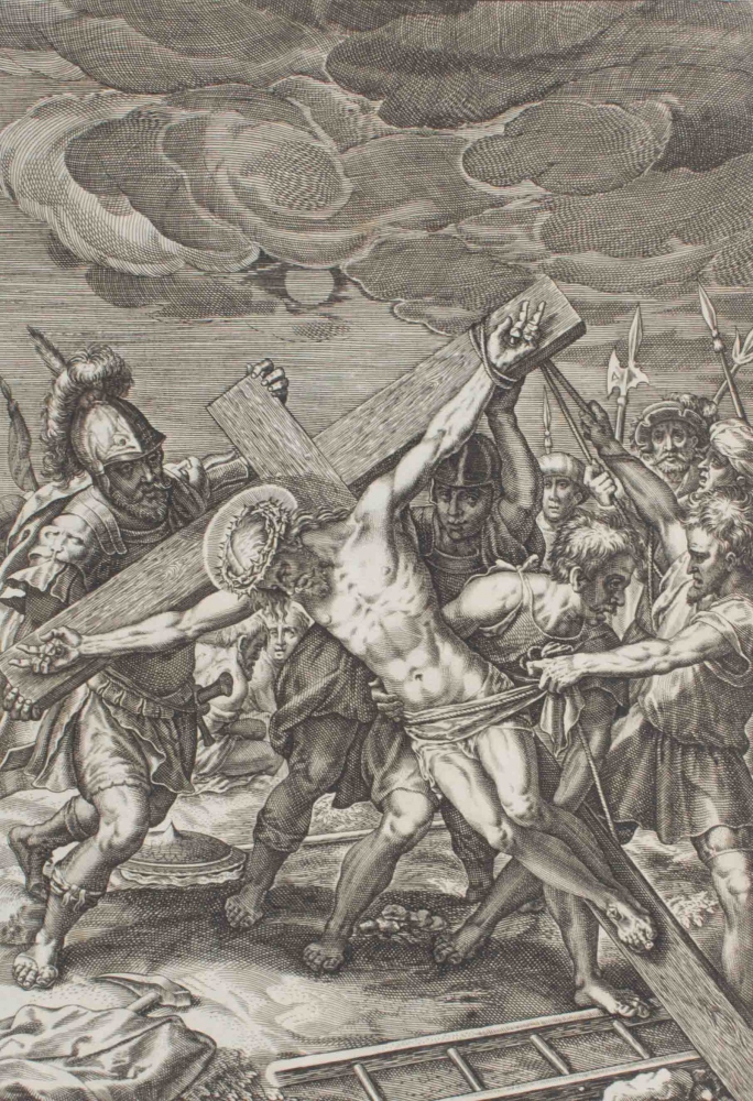 Extremely rare print series after prints by Johannes Sadeler I; even single prints from this series rarely appear on the market. The Rijksprentenkabinet possesses a series of 9 prints, including Het Laatste Avondmaal, a print not included in our series. Most certainly present are (in this order): Christus voor de hogepriester; De bespotting; de kruisiging; de geseling; Christus valt onder zijn kruis; Pilatus breekt zijn staf; Christus ontdaan van zijn kleding; Christus aan het kruis.