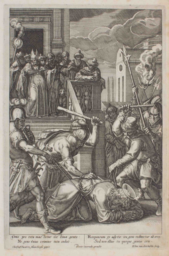 Series of 8 (of ?) prints all 29 x 19 cm. and signed in the plate "Elias van den Bossche", after prints by Christoph Schwarz, published by Pieter Overraat, bound together in 19th-century cover, folio.