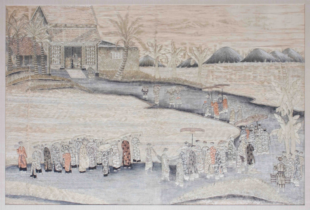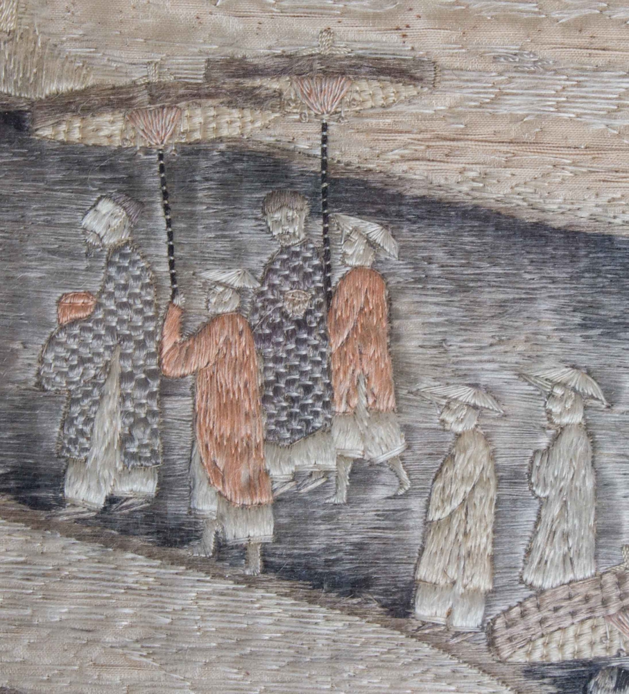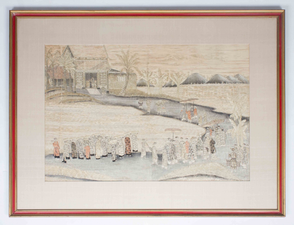 Embroidery on silk, late 19th/first half 20th century. 41 x 60 cm. Mounted in cloth, framed under glass. Outside size 61 x 81 cm.