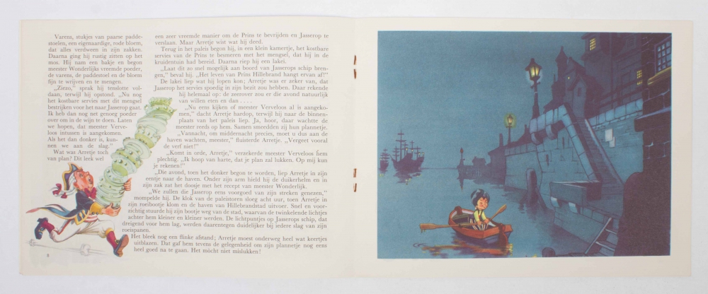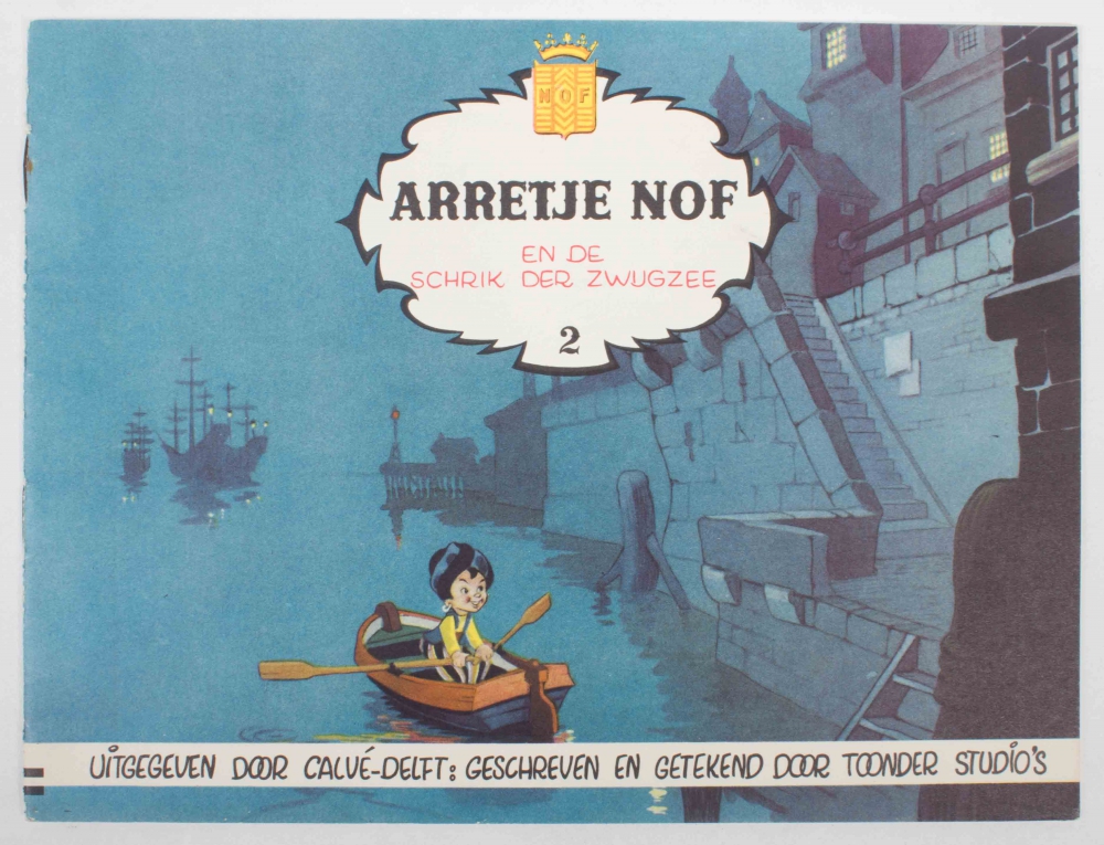 De wondere avonturen van Arretje Nof. Verlucht sprookje door Johan Fabricius. Delft, Oliefabrieken Calve-Delft, [1928]. 119 p. orig. pap. cover. Oblong. Quire loose + the series loose in ribbon-bound case, vol. I to V, 1926-27 + reissue, complete series + 13 doubles - and Calvé Delft. Vol. 1 to 8 (all eight new vols.). Written and drawn by Toonder Studio's.
