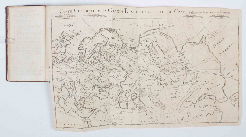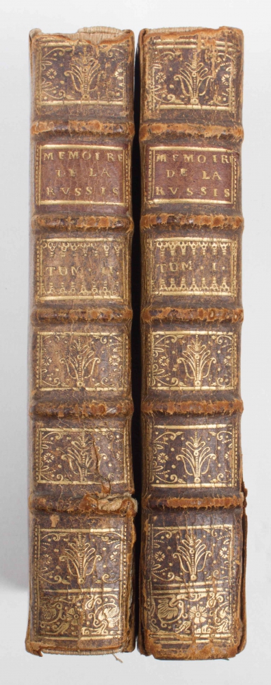 Paris, Pissot, 1725. Two vols. xxiv,438; [6],426,[4] pp. 8vo, bound in leather with ribbed back and gilt binding decoration. With two large folding maps, one of the Russian Empire and a map of St. Petersburg.