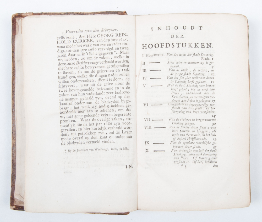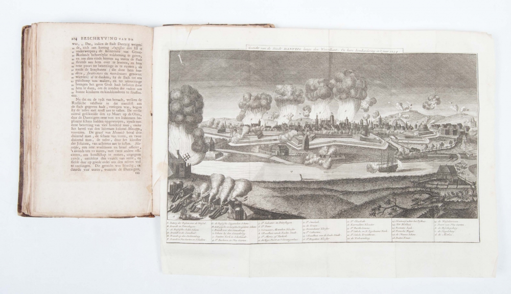8vo. Half leather, title on spine in black and gilt stamping, title in red and black with printer's vignette, (6),298,(10),(2) pp., with 50 folding engravings (lacks the Farkerk van St. Maria; probably not included at binding; 2 extra prints at the end). Spine with sm. dam., one print with sm. tear and another (Bombardering 1734) taped, else good copy of this rare publication.