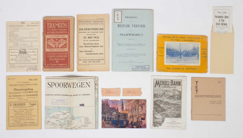 Zak-dienstregeling bevattende den volledigen dienst ingaande 22 mei 1932 op de tramwegen Wemeldinge-Goes etc. + Tramgids met bijbehoorende autobusdiensten 5 october 1924. Oficieele uitgave der Nederlandsche Tramwegen + Officieele gids ten dienste van het Lokaal en Interlokaal Autobusverkeer van Tilburg en omstreken, juli 1926 + 7 more + Regeling van het Militair vervoer over de tramwegen. Breda, de Koninklijke Militaire Academie, 1911. 42, 42 pp. 2 vols.
