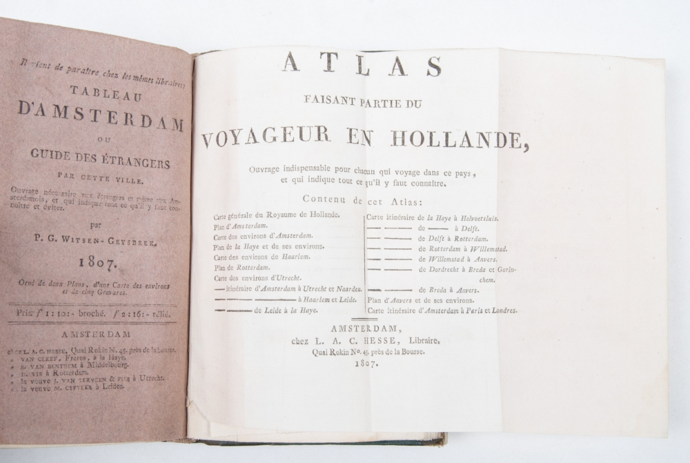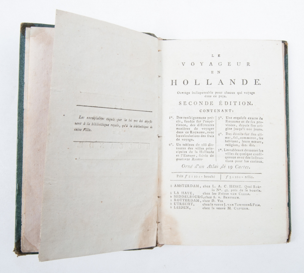 Ouvrage indespensable pour chacun qui voyage dans ce pais. Contenant: 1. Des renseignements précis, fondés sur l'expérience, des différentes manieres de voyager dans ce Royaume, avec les calculations des frais de voyage. 2. Un tableau de 288 distances (...) suivi de quatorze routes. 3. Une esquisse exacte du Royaume (..) Orné d'un Atlas de 19 cartes. Amsterdam, L.A.C. Hesse [et al] [1807].