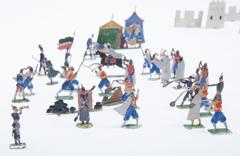 Impressive collection with more than 200 soldiers, tents, a castle under fire, palm trees, Arabs, blazing cannons etc. Probably multiple scenes. 19th century.