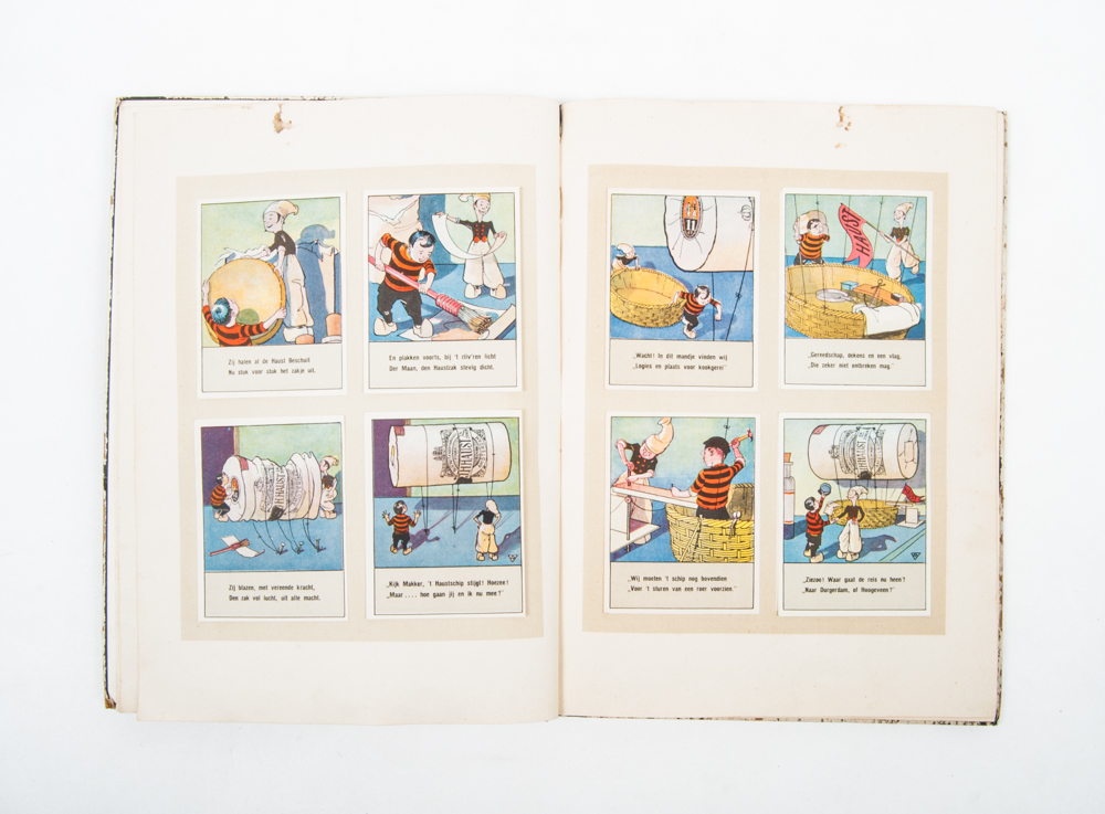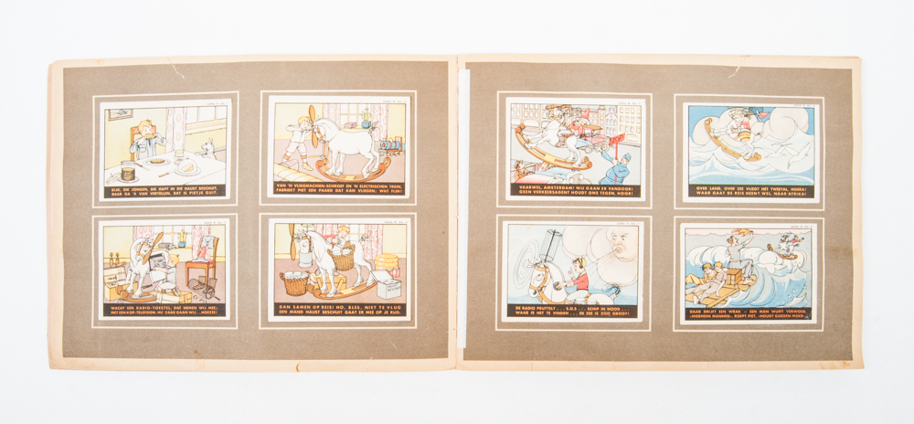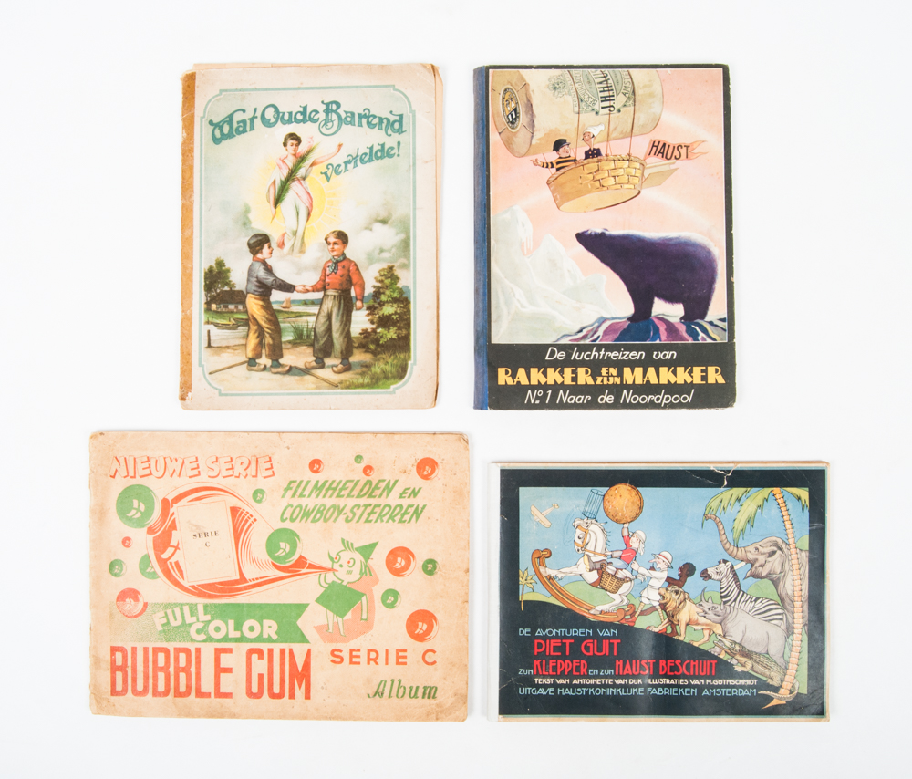 Oblong, cordbound. Complete with all 102 pictures, ca. 1920. Text by Antoinette van Dijk, illustrations by M. Güthschmidt. Lovely copy + De Luchtreizen van Rakker en zijn Makker no. 1, Naar de Noordpool. (Idem), 1930. Complete. Small wormhole in top margin + Wat Oude Barend vertelde! Coop De Eenheid, Zaanstreek, ca. 1935. Complete. A number of pp. loose in cover, poor copy + Nieuwe serie Filmhelden en Cowboy-sterren, Full color album. Series C. Bubble Gum. Stapled oblong scrapbook with concise text blocks with the pictures. Incomplete. Very rare. Poor copy.