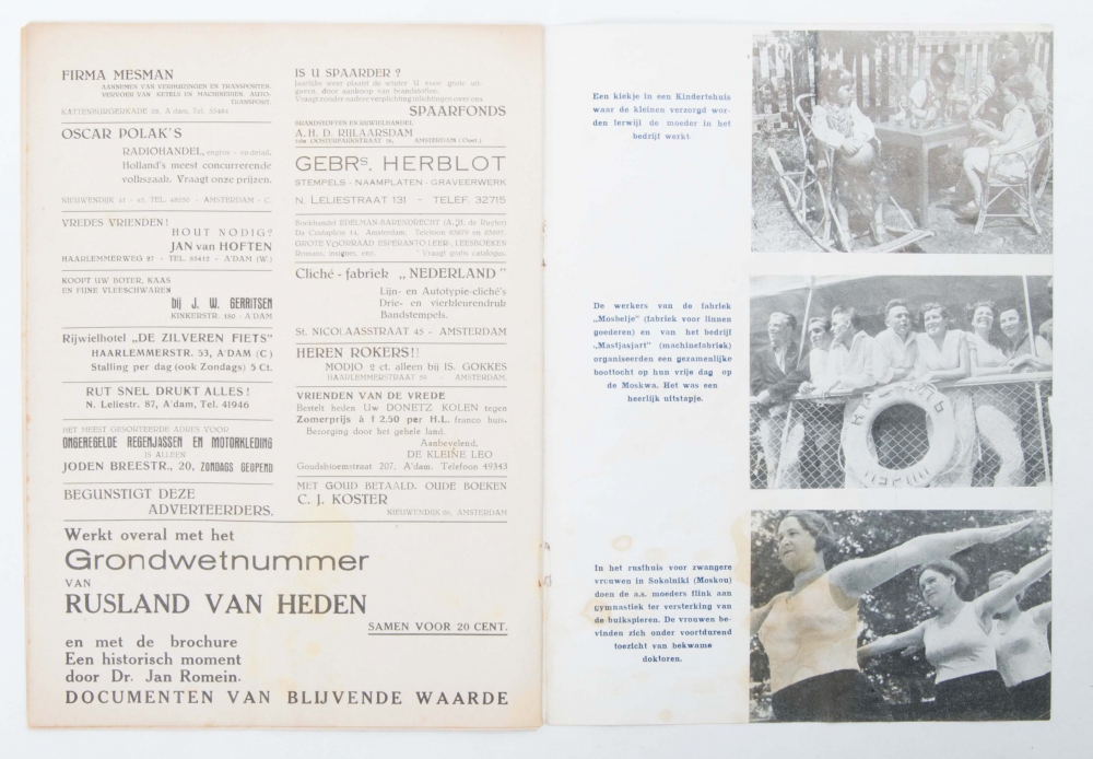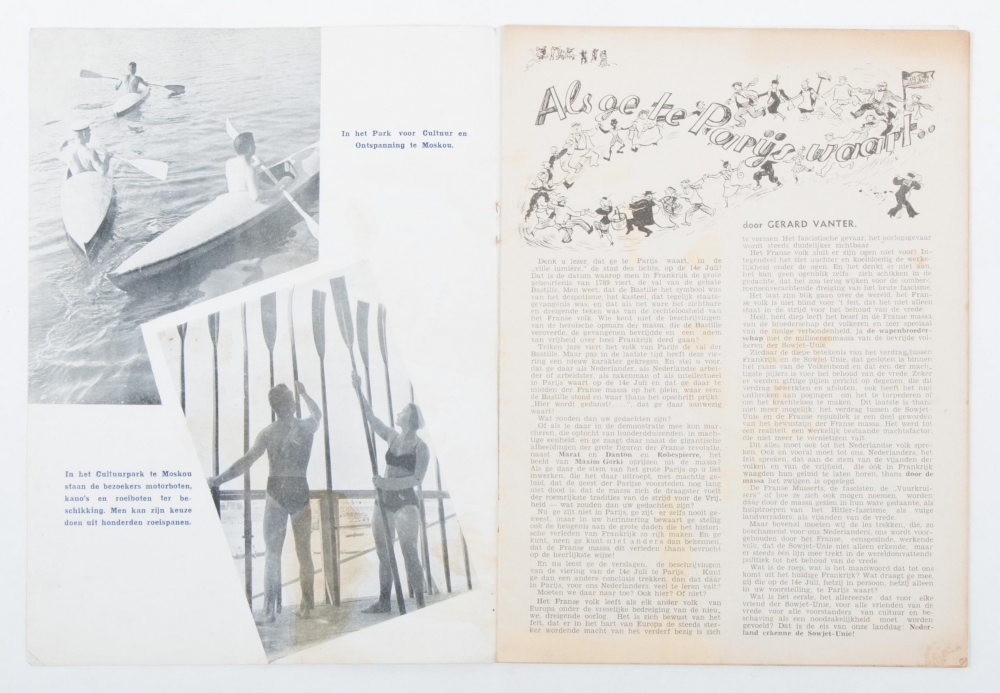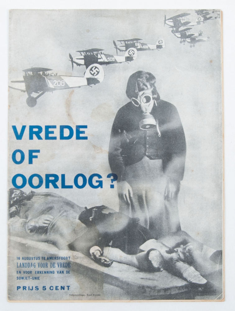 16 augustus te Amersfoort Landdag voor de vrede en voor erkenning van de Sowjet-Unie. no place, publisher or year (1936), (16) p., original photomontage cover by Karl Vanek [= Hermann Leupold], 4to.
