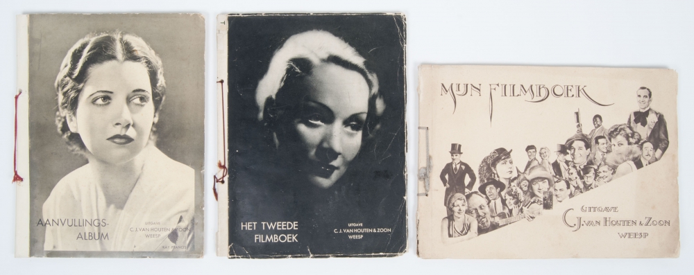 Mijn filmboek, 1931. Cord-bound, oblong album. Complete with 84 pictures + Het tweede filmboek, 1932. Complete with 84 pictures. Sev. sm. tears in margin, fairly good copy + Aanvullingsalbum, 1934. Complete with 84 pictures. Neatly rebacked, else good copy.